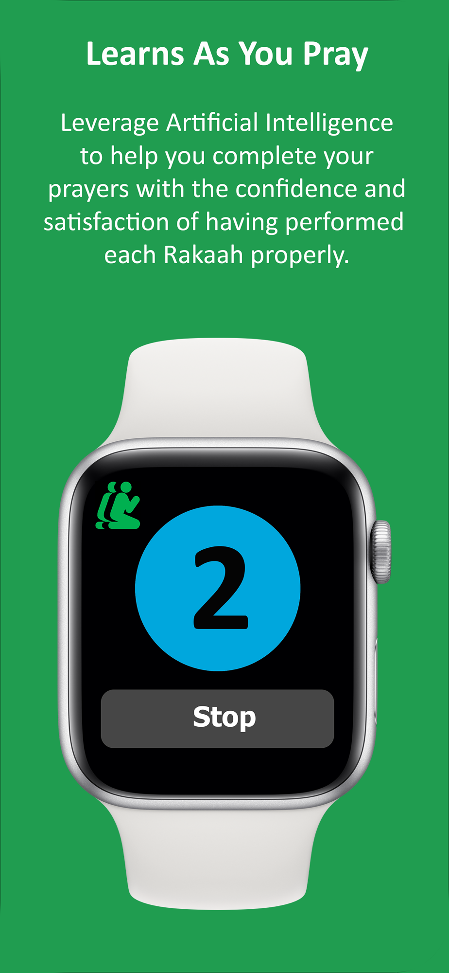 rakaah.ai is a smartwatch (SE, and Series 4 or higher) app designed to help Muslims complete their prayer with confidence and satisfaction by counting their Rakaah and alerting them if they forget.