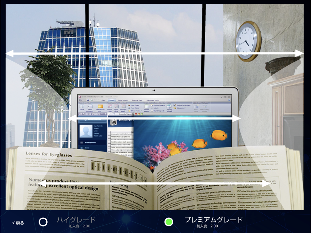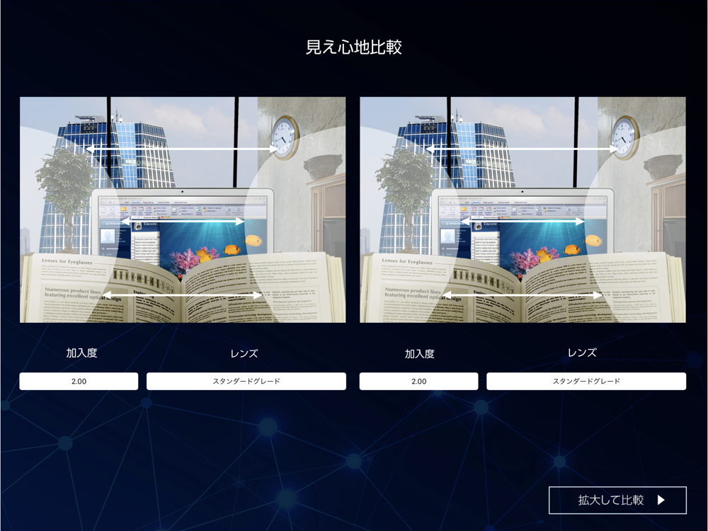 メガネレンズのグレードによる見え方の違い(見える幅の違い)を画像イメージでお伝えするシミュレーターです。