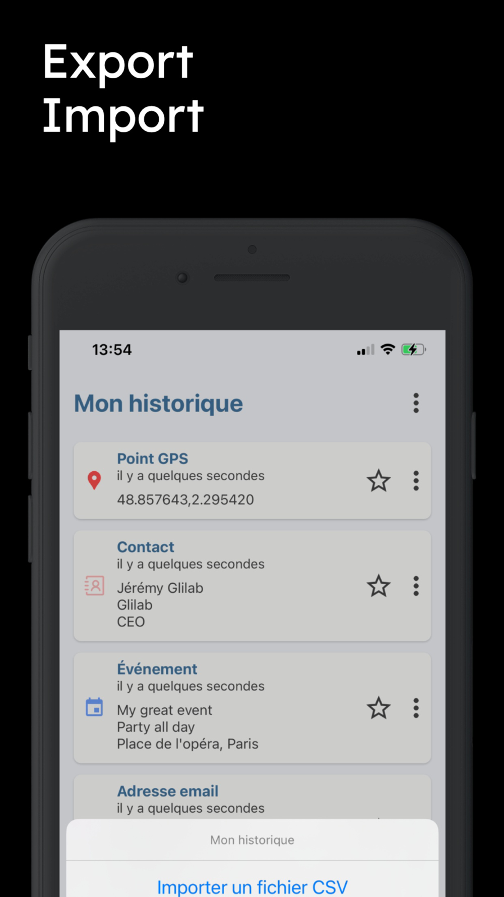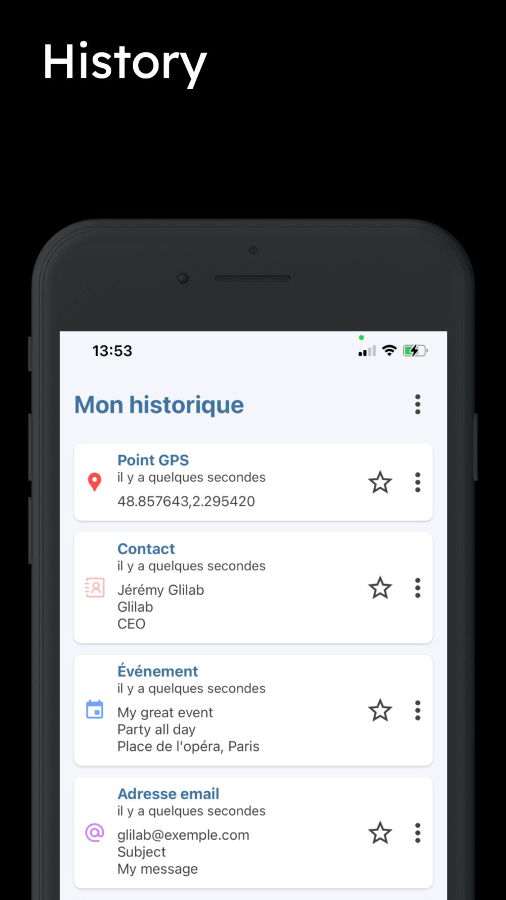 You can save all your QR Codes locally on your phone so you can export them in different formats for backup or sharing with others.