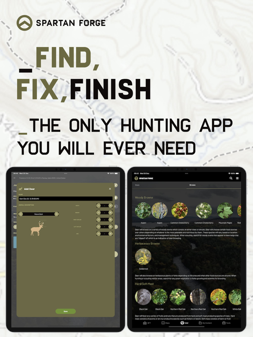 Spartan Forge is an all-in-one AI driven platform for planning and executing your hunt. It features higher resolution imagery and better mapping features than any other product on the market, complete with the industry's only LiDAR layer. Real-time pin sharing with the Blue Force Tracker capability enhances group coordination and intel sharing. Updated property ownership and timber layers provide further valuable insight for hunters and an unrivaled digital scouting experience.