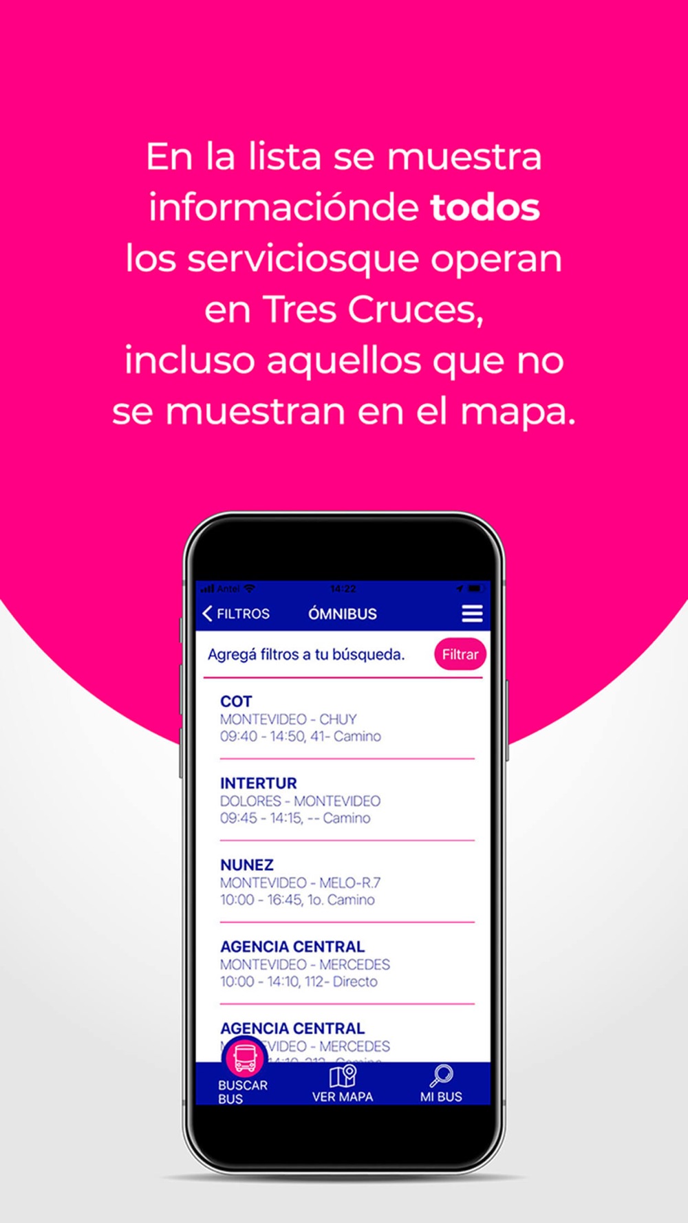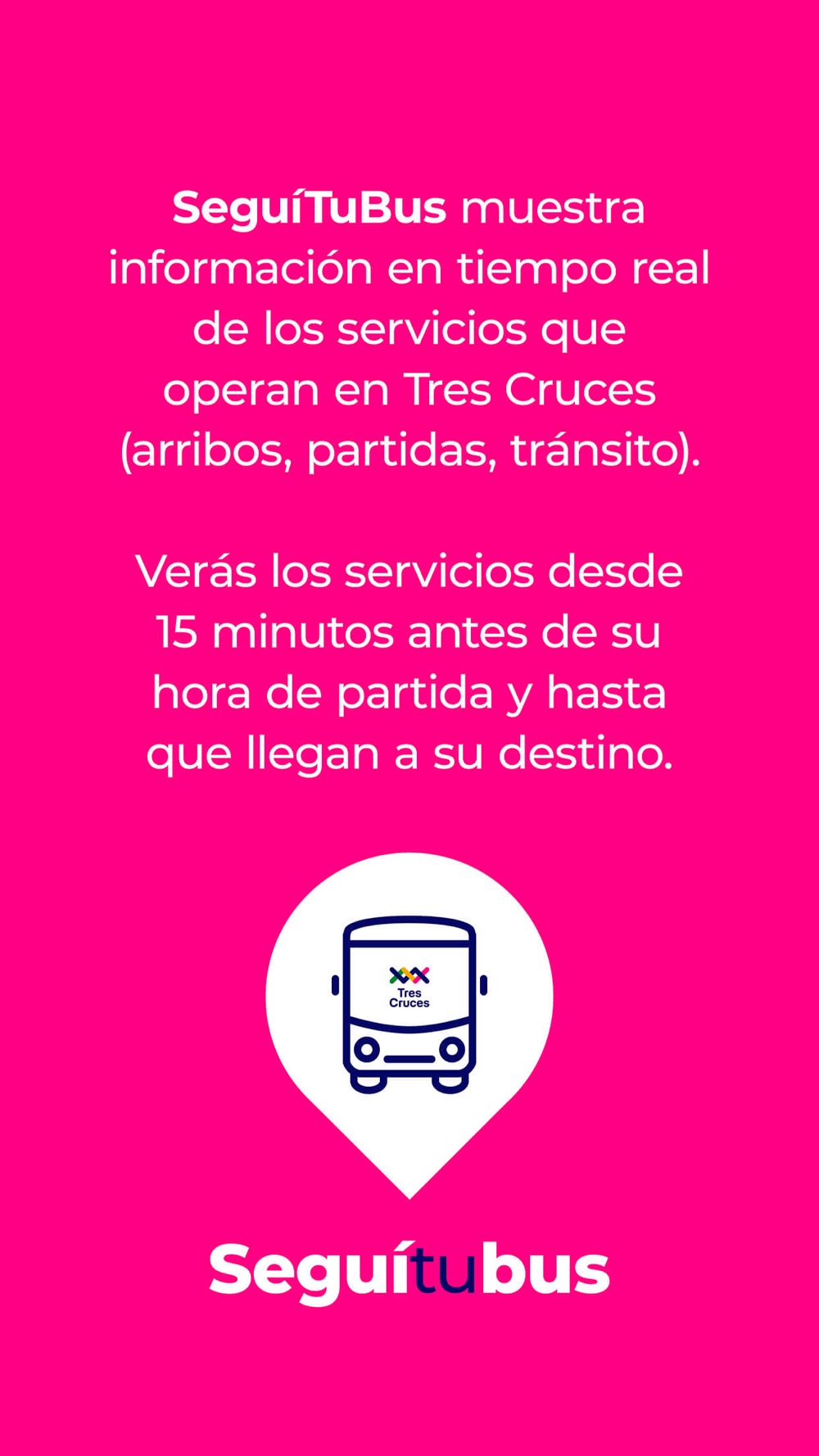 SeguíTuBus es una App que brinda información en tiempo real de los ómnibus que parten o arriban en la Terminal de Tres Cruces (Montevideo) pudiendo visualizar su ubicación en cualquier punto de Uruguay mientras el ómnibus está realizando un servicio. Para usar la App no se requiere usuario, contraseña ni cualquier tipo de datos personales, solo es necesario buscar el servicio de tu interés a través de los filtros que la App proporciona. Para facilitar la búsqueda, se cuenta con filtros por ciudad de origen, ciudad de destino, empresa, horario, entre otros, los cuales permiten visualizar los distintos servicios sobre el mapa o en una lista. Mientras que en la lista de SeguíTuBus se muestran todos los servicios que se están realizando, en el mapa se muestran solo aquellos servicios cuyos ómnibus cuentan con dispositivo de rastreo.