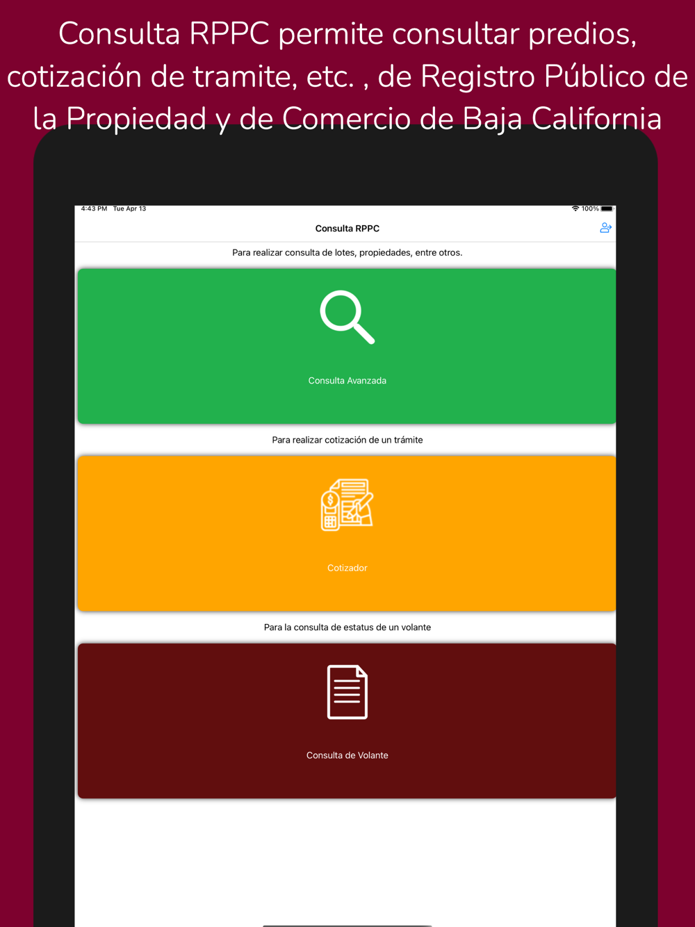 Consulta RPPC es una app que te permite consultar información pública registrada en Registro Publico de la Propiedad y de Comercio del Estado De Baja California