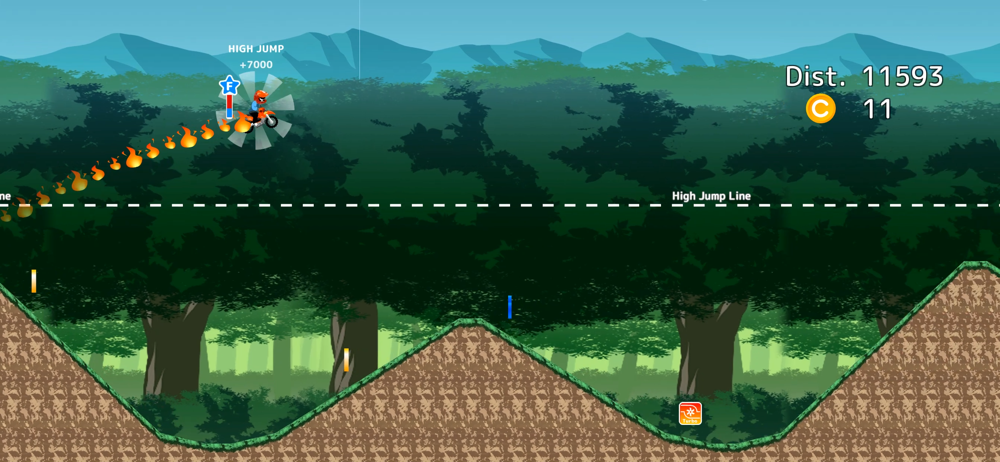 Higher! Farther! It's a race to see how far you can go! If the landing timing is good, it will accelerate, so you can fly high in the next jump!