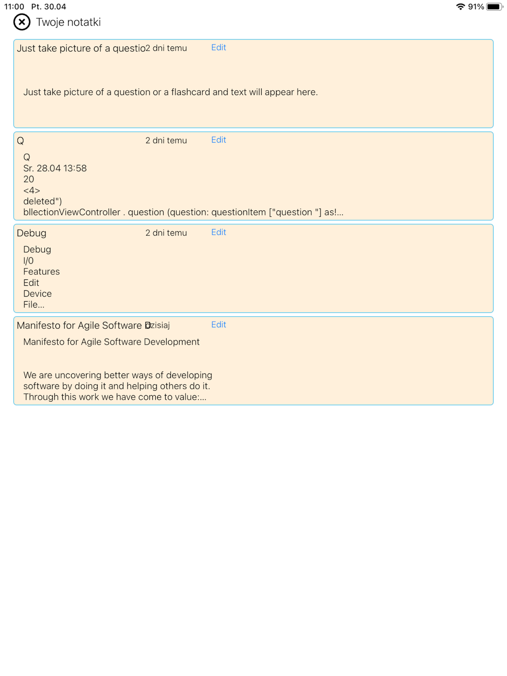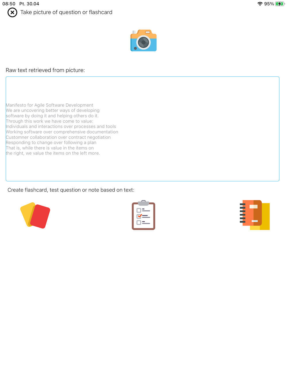 Application uses built-in camera to take picture of test question of flashcard, then it converts it to text, and finally it allows user to create collection of flashcards, notes and test questions in the cloud.