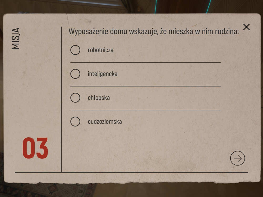 Interaktywna gra „Podróż w czasie”, to projekt dzięki, któremu można dowiedzieć się więcej o losach polskich rodzin w czasie niemieckiej okupacji. Projekt daje możliwość przeniesienia się do realistycznie odwzorowanego wnętrza przedwojennego, warszawskiego mieszkania. Gra została przygotowana na podstawie naszej wystawy dla dzieci, z wykorzystaniem silników gamingowych Unreal oraz Unity.