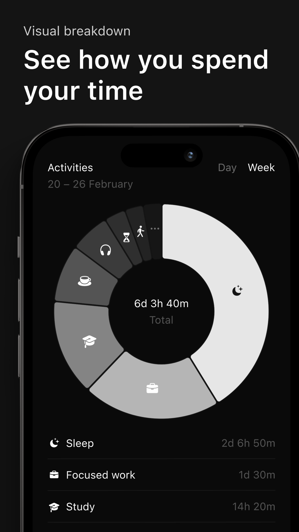 - Analyze how much time you spend on each activity daily, weekly, or in total.