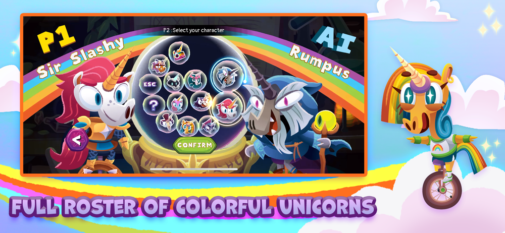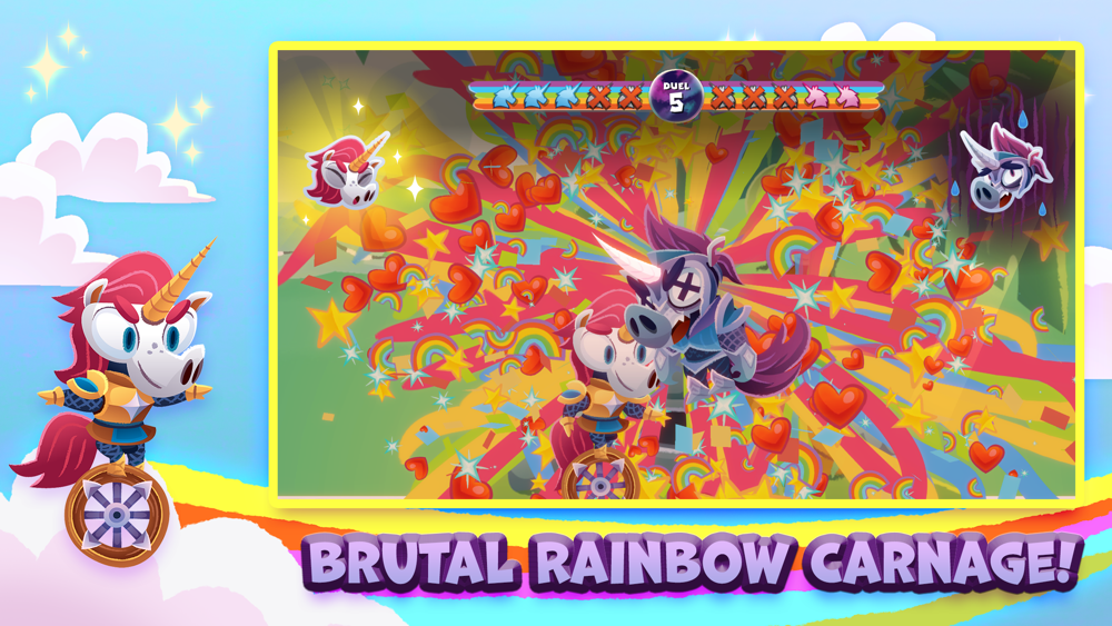 Turn your horns into swords in this wacky and sweet physics-driven rainbowcore fighting game featuring jousting unicorns. Battle against other colorful unicorns on many unique levels while balancing on your trusty unicycle. Sharpen your horn and get ready for a bloody, mythical rainbow showdown!