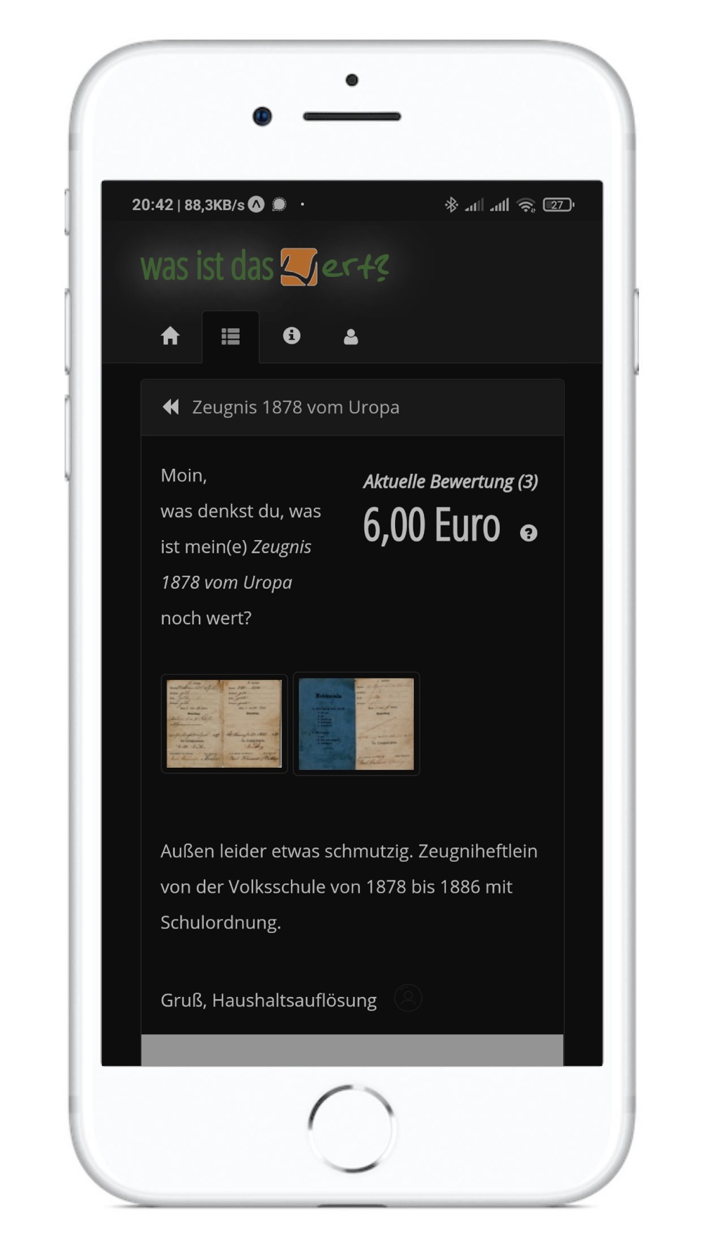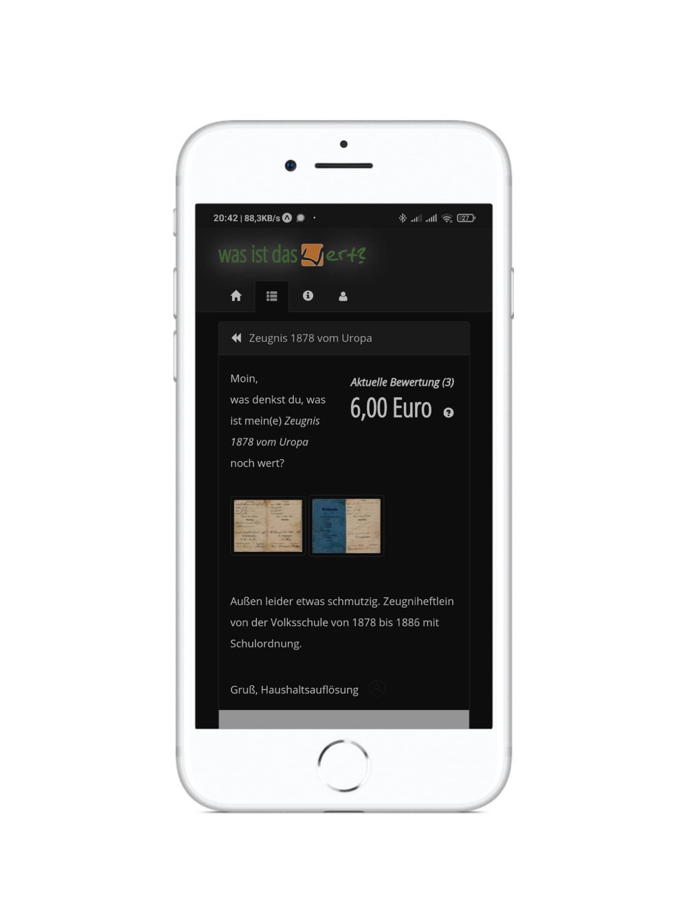 Dann bist du hier richtig. Einfach Inserat anlegen und die Nutzer fragen, was sie denken, was dein Trödel noch wert sein kann. Schneller, bequemer und objektiver geht es nicht!