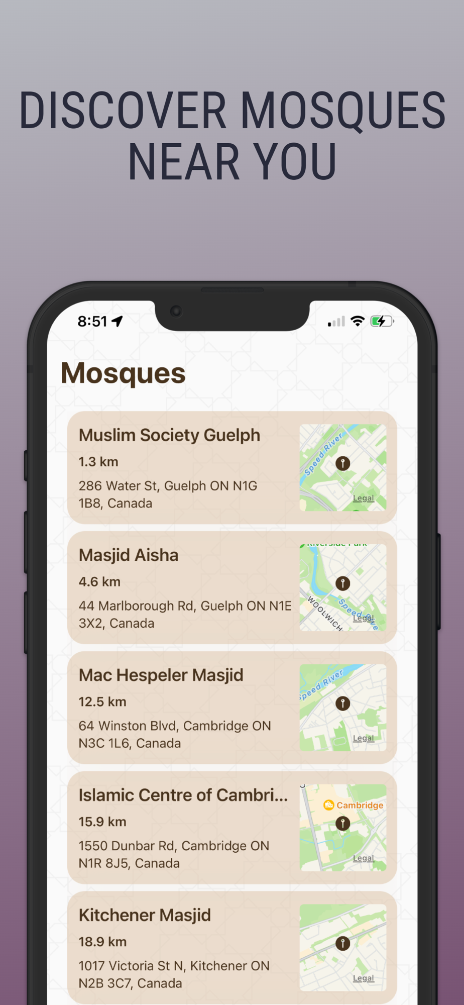 Mu’min offers a new feature that allows you to locate Mosques near you. With the new Mosques feature, you can easily discover mosques closest to you while on the go.