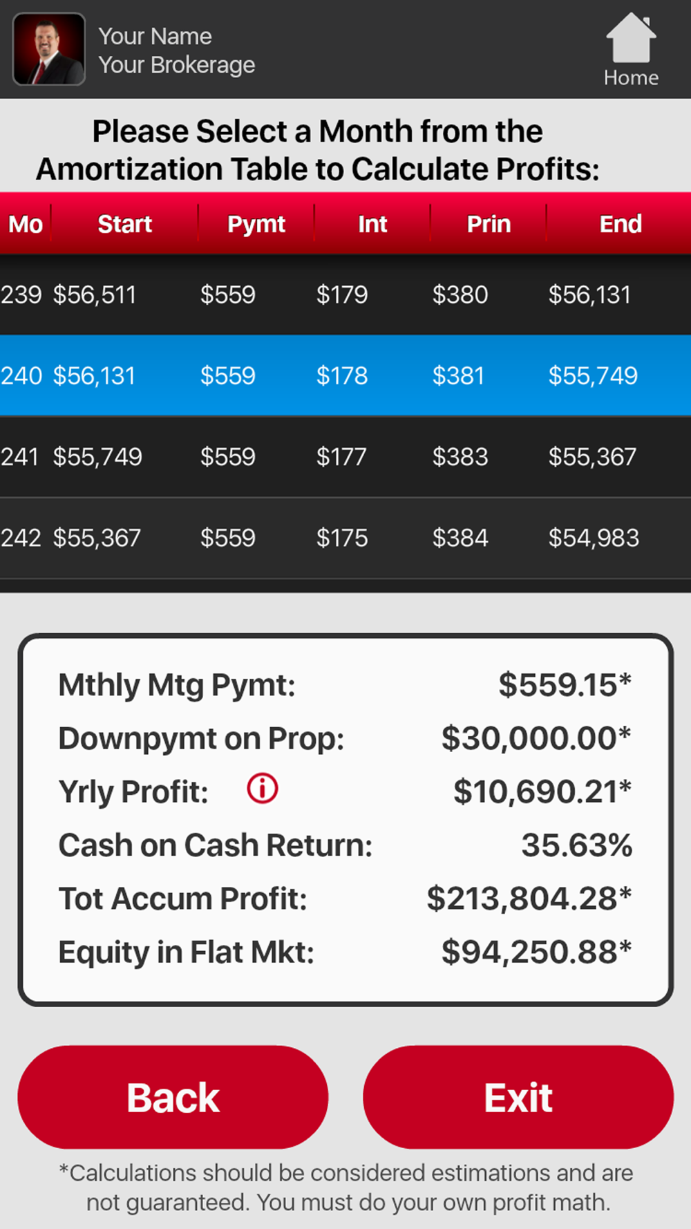CALCULATE PROFITS - The app includes a profit calculator so that you can quickly estimate how much money you could make if you flip or rent a property. Calculate profits for a flip, and for rentals, you can calculate yearly profits, total accumulated profits, cash on cash returns, and equity over time.