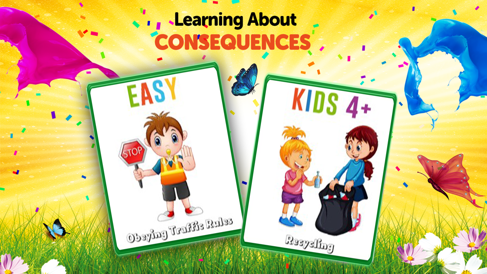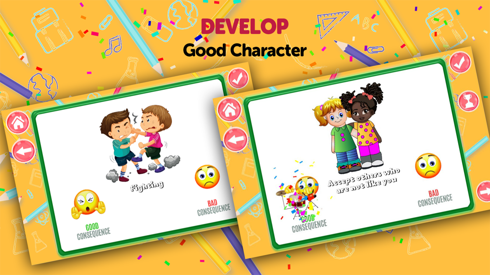 Educational game for Children ages 2-12 helps build their character and reinforces positive behavior with fun activities. Children learn The Lesson of Consequences and how the things we do and say can either have a good consequence or a bad consequence. Fun animation keeps children engaged while they earn gold stars and badges.