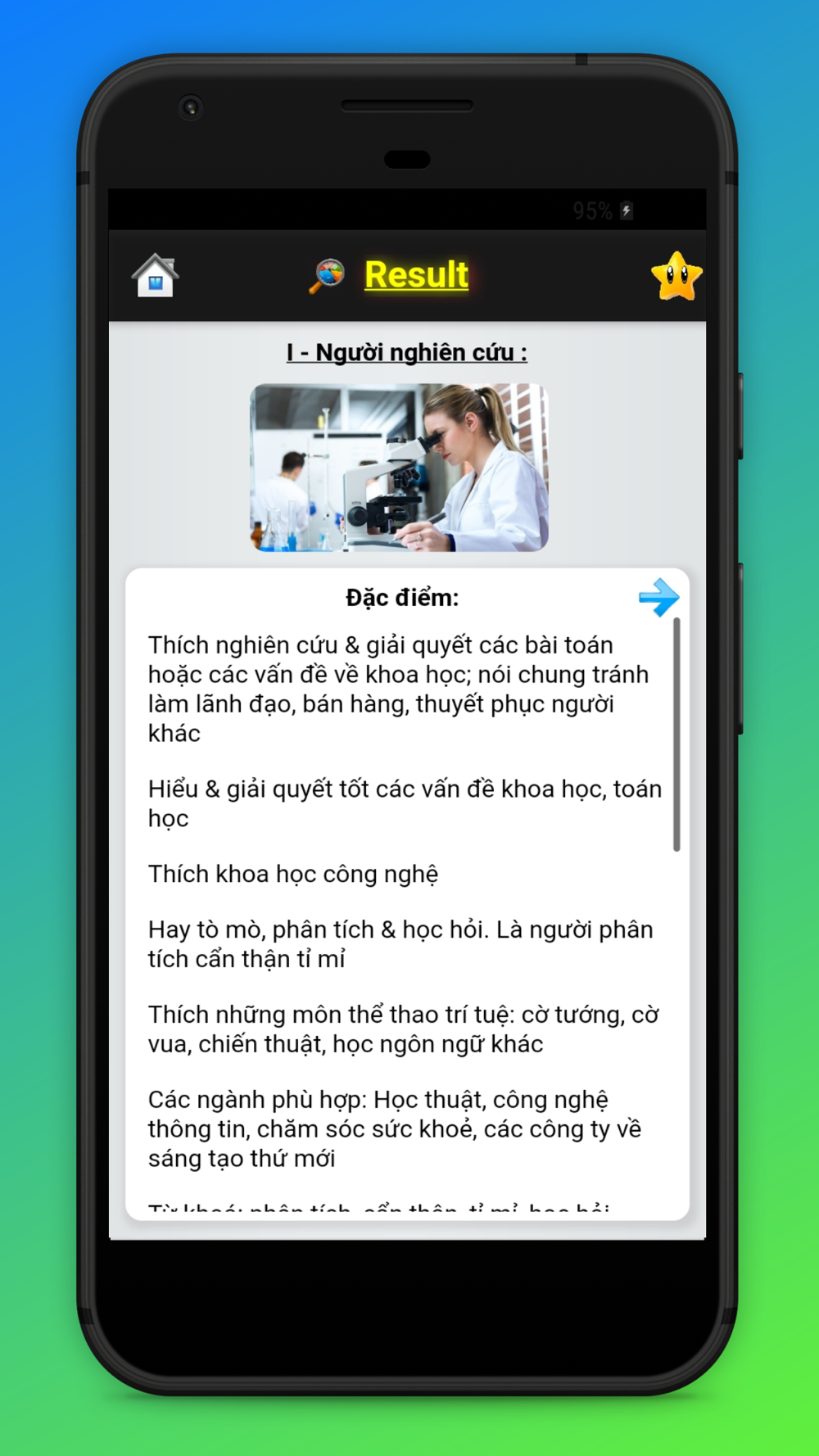 - Ngay khi tìm được sở trường, năng khiếu của mình bạn sẽ được gợi ý các nhóm ngành phù hợp với năng khiếu của bạn.