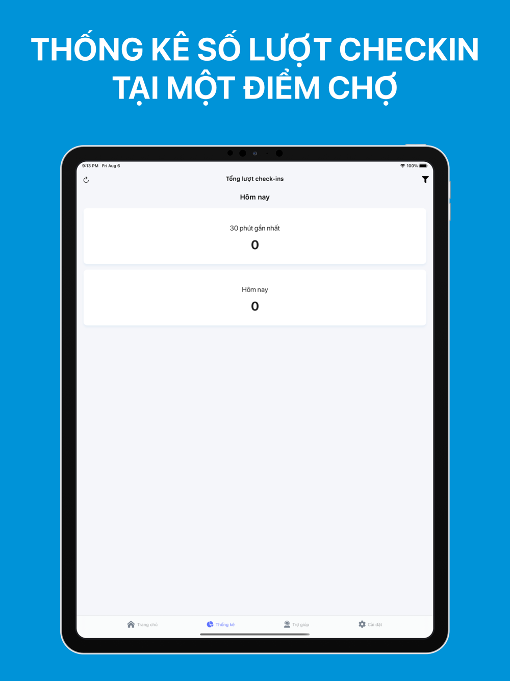 - Thống kê: Thống kê tổng lượt check-in trong vòng 30 phút gần nhất và trong ngày.