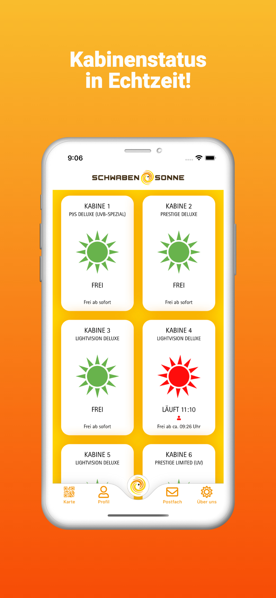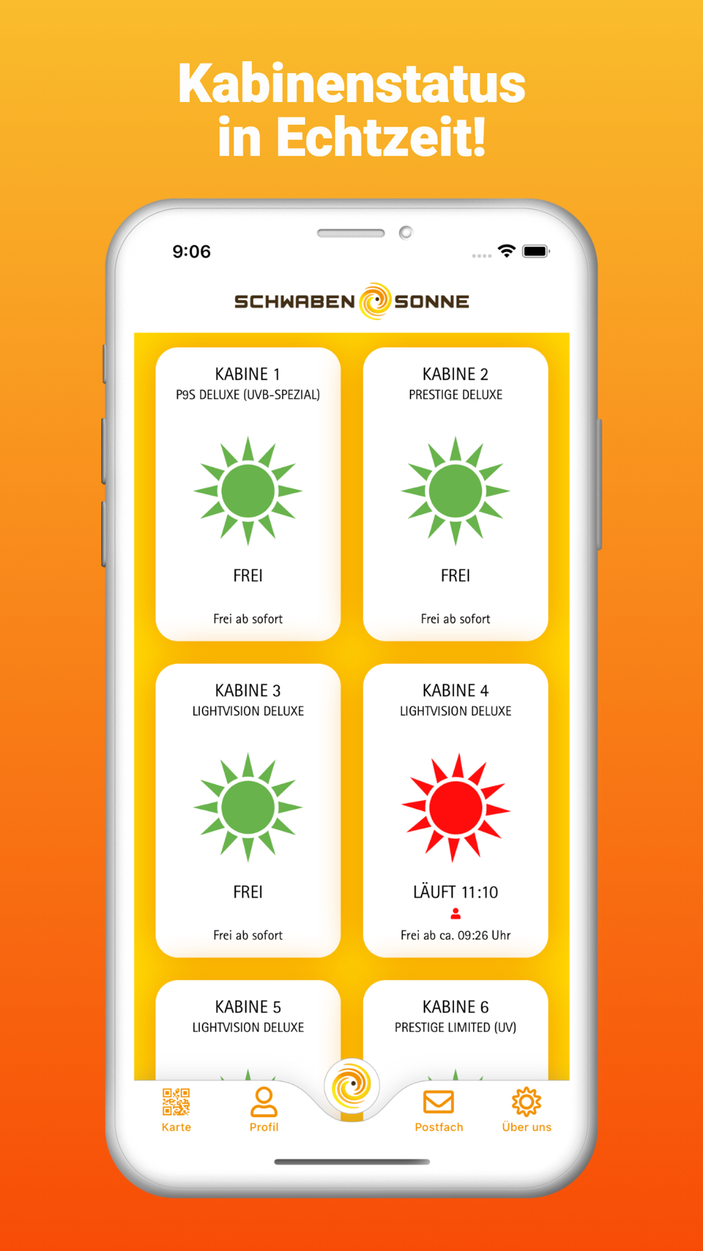 Die App bietet dir neben aktuellen Angeboten, Öffnungszeiten, Aktionen und Informationen, auch den augenblicklichen Kabinenstatus in Echtzeit, von deiner Schwaben Sonne. Somit weißt du immer, ob, oder wie lange, deine Lieblings-Sonnenbank noch läuft.