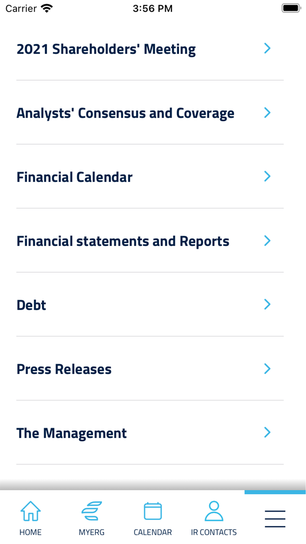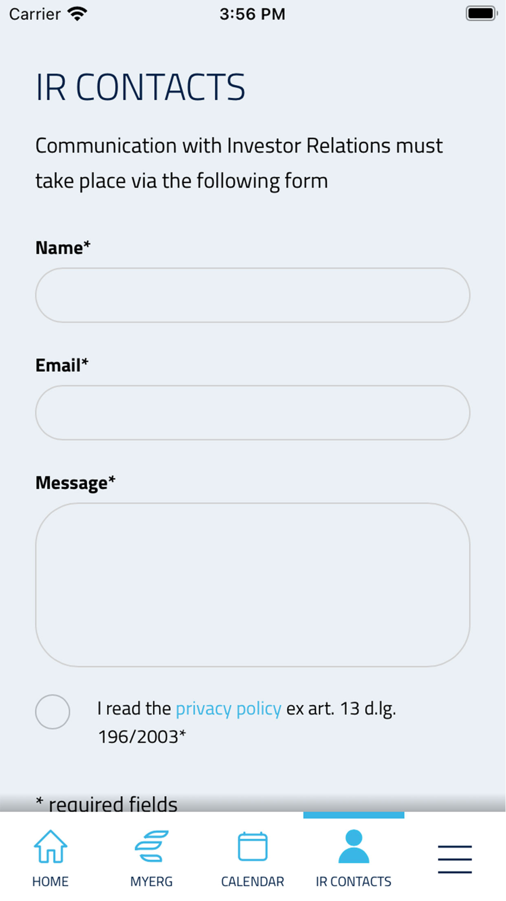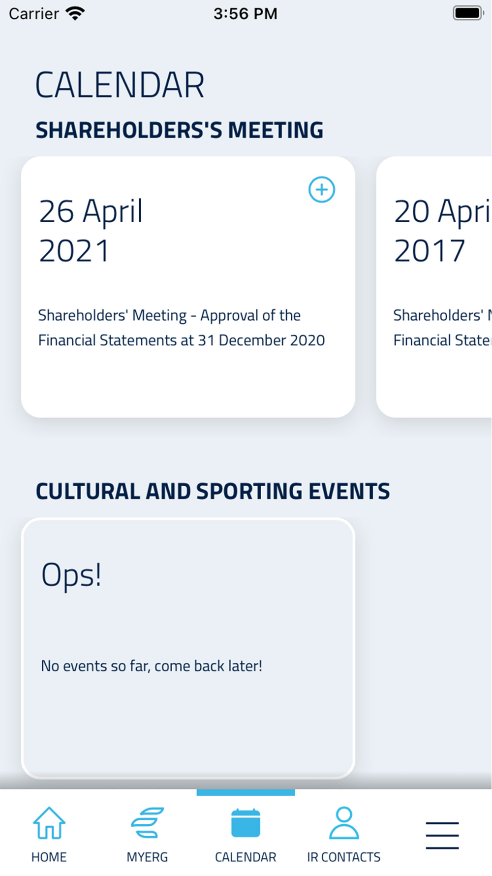 With the ERG Investor app you can get real-time updates on all of the Group’s main financial information: its daily share price performance, financial calendar, strategy, press releases, reports and presentations. Thanks to the app it is also possible to watch live streams of investor meetings and interact with the speakers via a messaging system active during live events. The app also includes a push notification service so users can stay up to date on the availability of new documents.