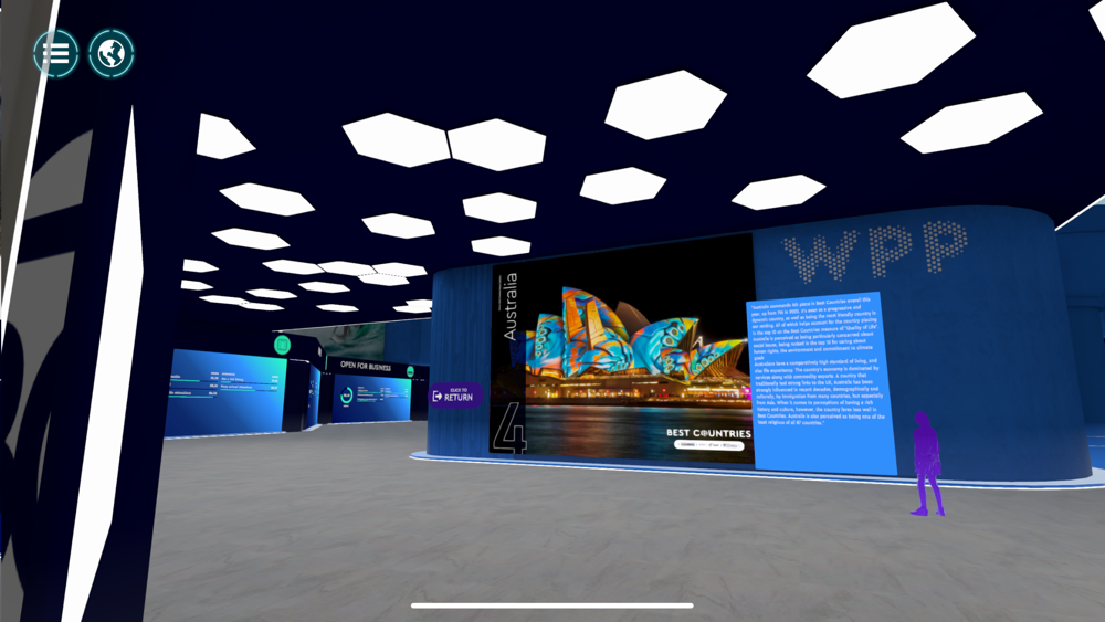 Immerse yourself in a futuristic journey around the world. Visit the Arrivals Hall to be welcomed by David Roth, Chairman of WPP BAV and CEO WPP The Store. Move into the Departures Hall and watch a range of exciting and moving interviews with BAV analysts and experts in helping brands in the modern global economy. Visit the mezzanine floor to explore the range of reports and articles to download, and visit the surround cinema for the Best Countries Countdown for 2023. After visiting the sights of the Departures Hall, take your Hyperloop tour and select a destination from the 85 countries available on the giant main departures board. Each country location contains report data that provides a unique view of how each country is perceived globally, its culture and citizens, and what impact each country brand has on brands from that country. Get a clear picture of what the data means by through the dazzling charts exploring the Country Values and attributes that drive the data. Finally, view the Conference Pavilion when live broadcasts are available to see key notes speeches and live presentations. The is an exciting journey that will increase your understanding of how these countries can present new opportunities for global brand growth in 2023.