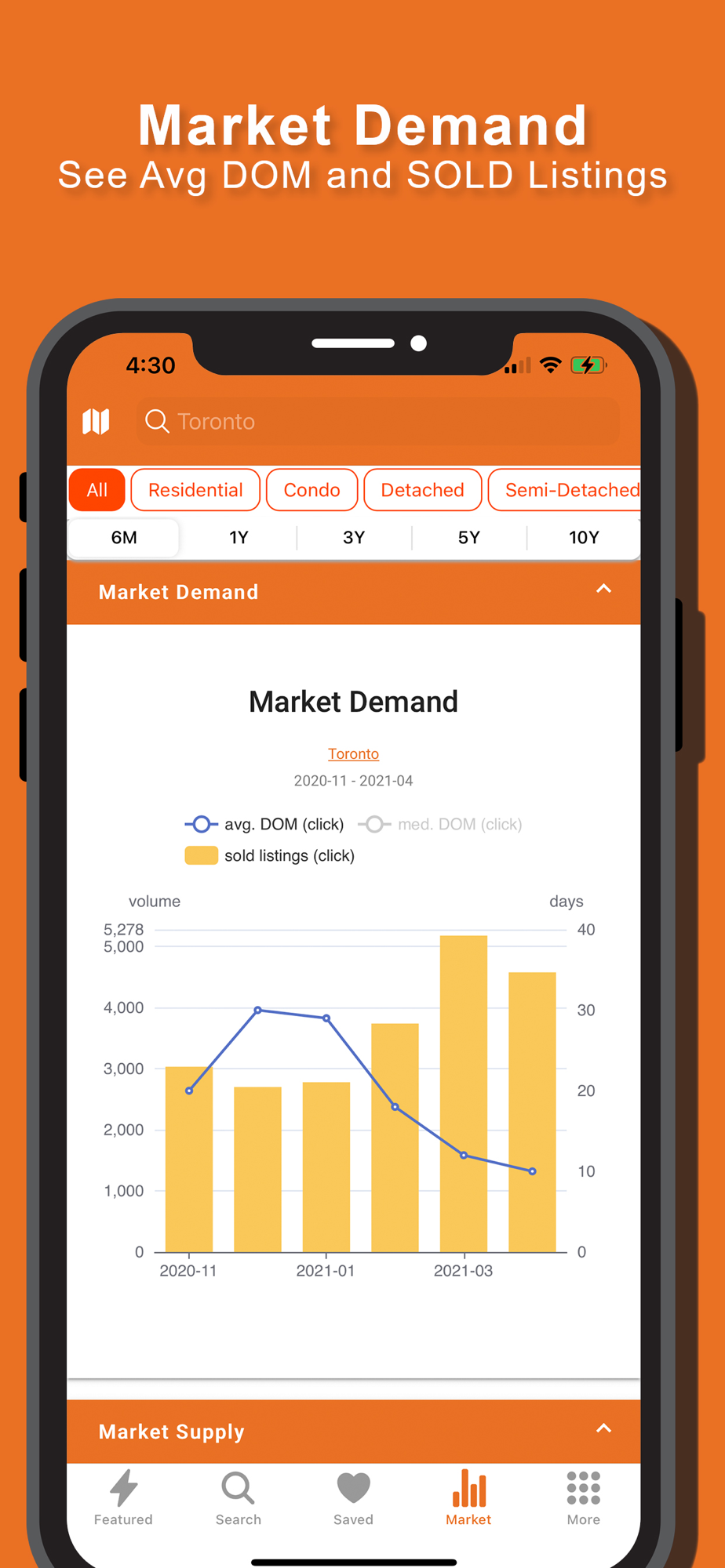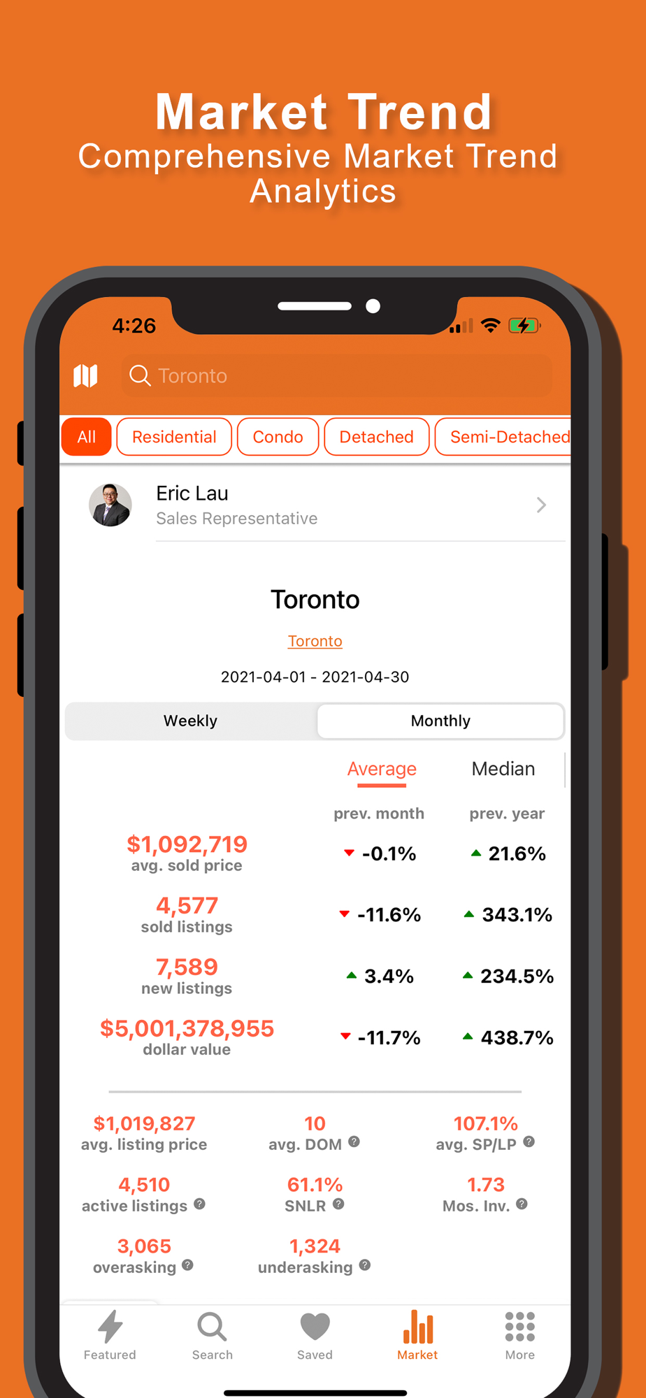 MARKET TREND ANALYTICS – Our App provides a Comprehensive Market Trend Analytic by Area, Municipality or Community. See the latest Average Sold Price of your desired Municipality such ‘Markham’ or ‘Richmond Hill’. Identify market trends by looking at our Market Demand and Supply comparison charts. Using our advance analytic features such as New Listings tracking, Average Days on Market and Market Balance Indicators and many other indicators to quickly get a sense of whether an Area, Municipality or Community is in a Buyer or Seller Market.