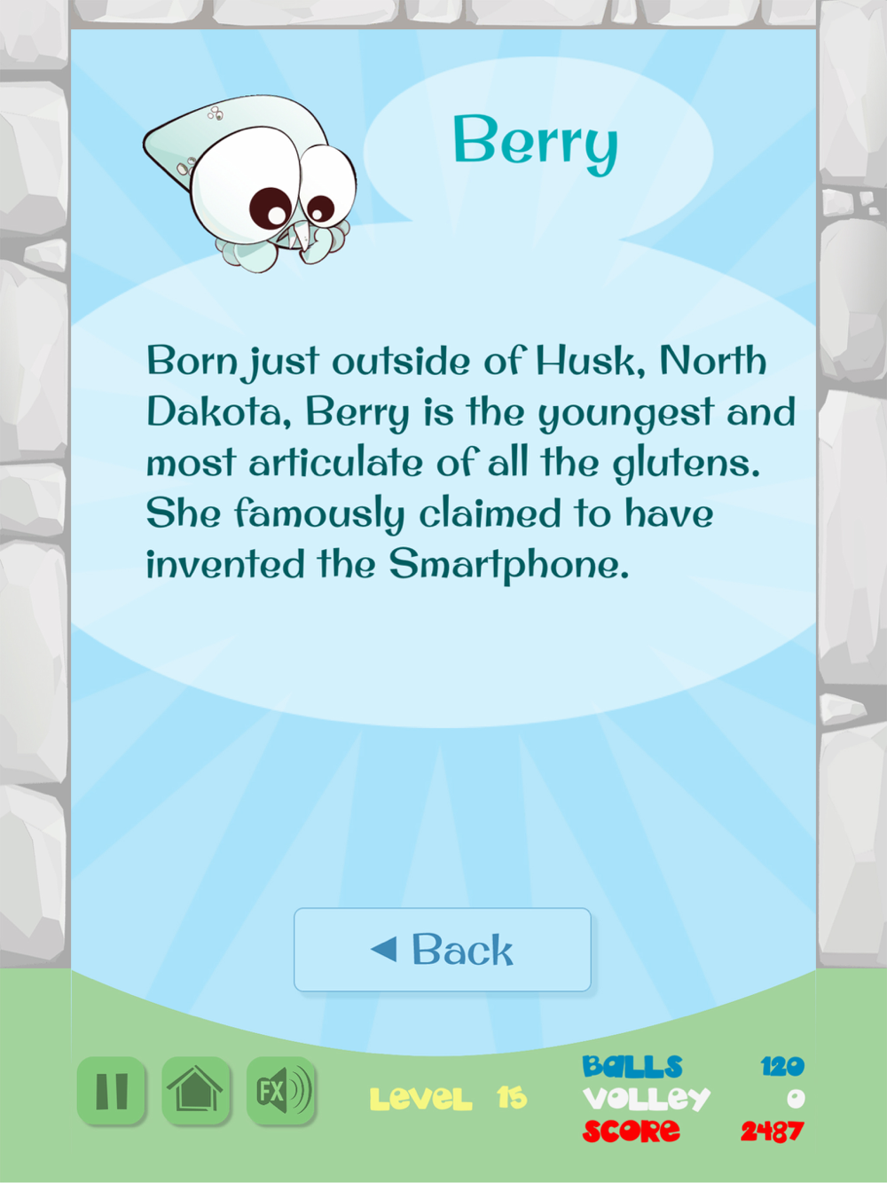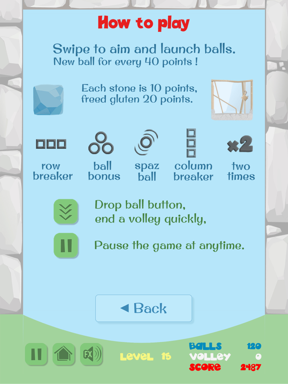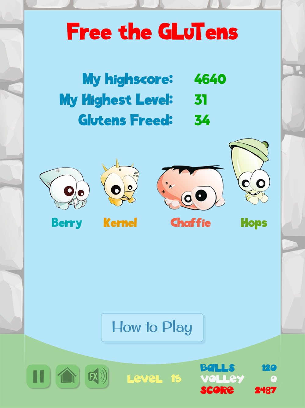 Play up to 30 levels. The highest score to date is 48,320 with all glutens freed and all stones smashed.