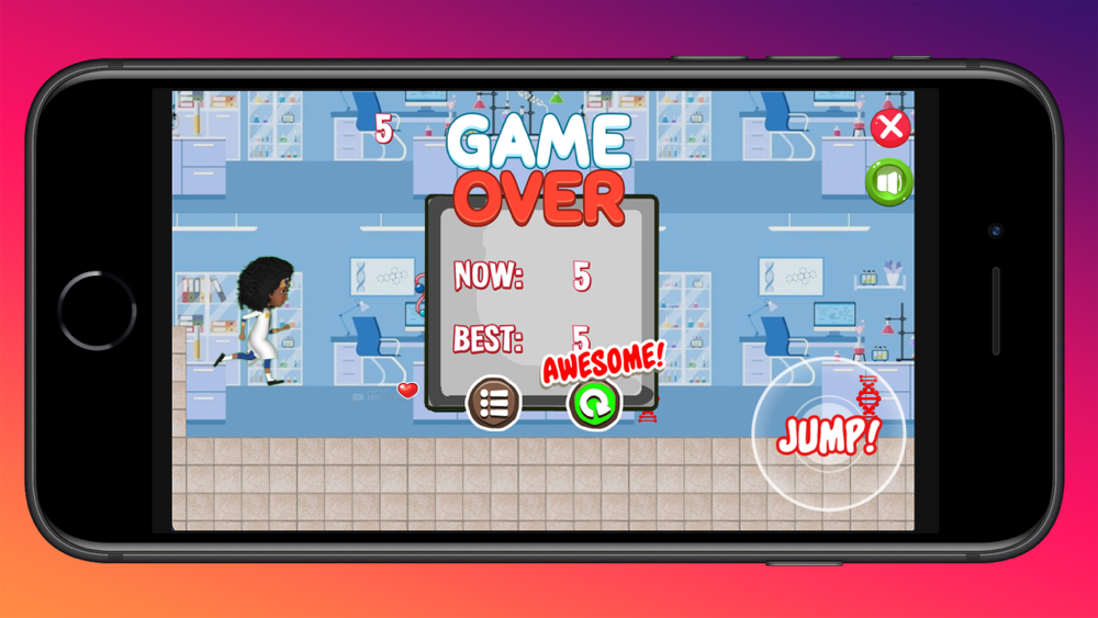 Help Lena Jellie Beana, the scientist, collect different objects around her lab and dodge incoming obstacles. Collect DNA molecules, atoms, and flasks as you run and jump to avoid germs and hazards, which can make you lose the game!