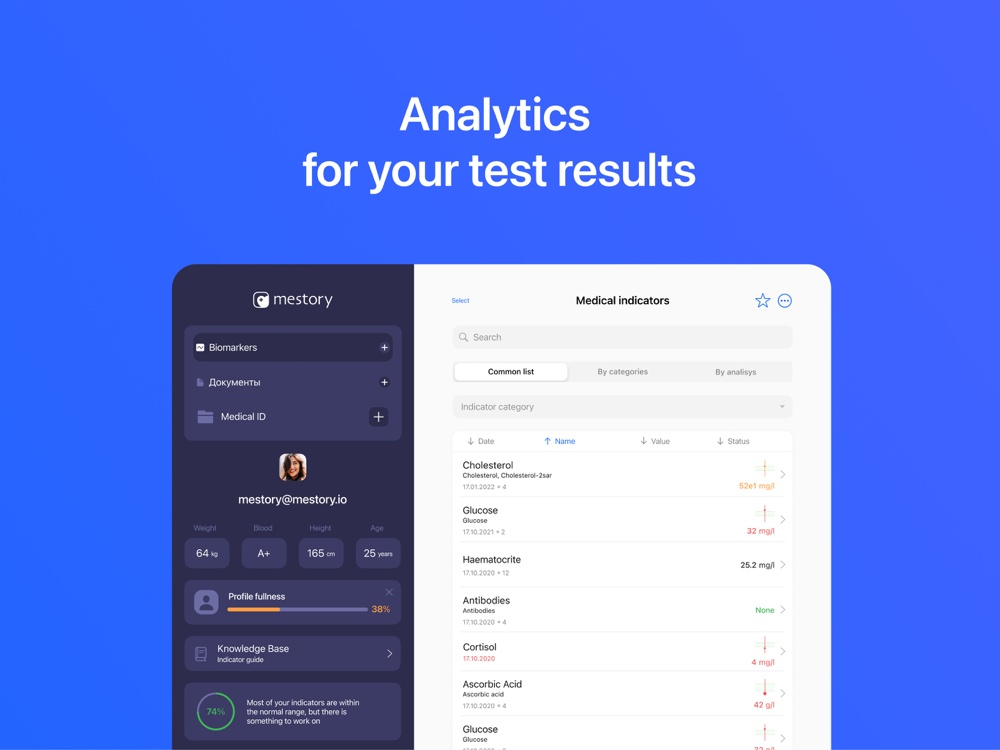 The app stores all your medical data and digitizes your analyzes. To digitize analyzes upload the PDF, send an email from any medical laboratory or just take a photo of the sheet with the results - the service will do everything by itself, and all the biomarkers will be displayed in a simple and understandable form in the app.