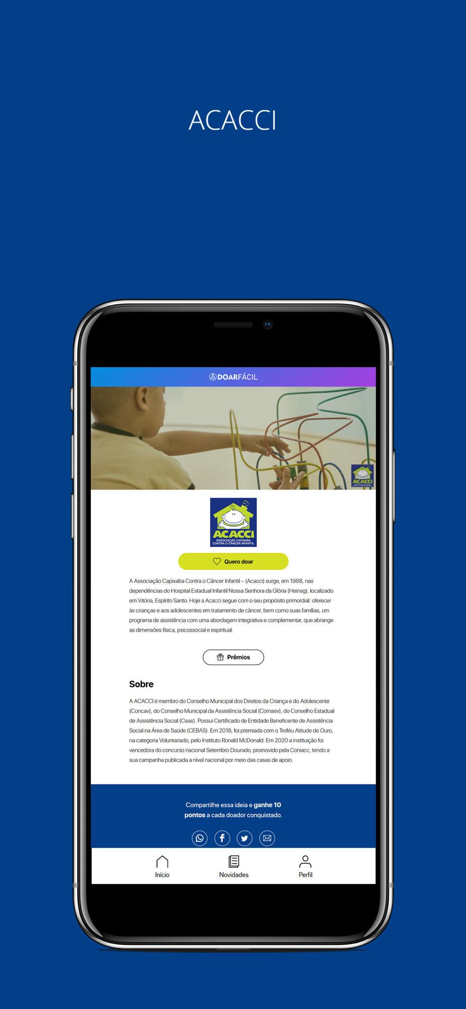 A Associação Capixaba Contra o Câncer Infantil – (Acacci) surge, em 1988, nas dependências do Hospital Estadual Infantil Nossa Senhora da Glória (Heinsg), localizado em Vitória, Espírito Santo. Hoje a Acacci segue com o seu propósito primordial: oferecer às crianças e aos adolescentes em tratamento de câncer, bem como suas famílias, um programa de assistência com uma abordagem integrativa e complementar, que abrange as dimensões física, psicossocial e espiritual.