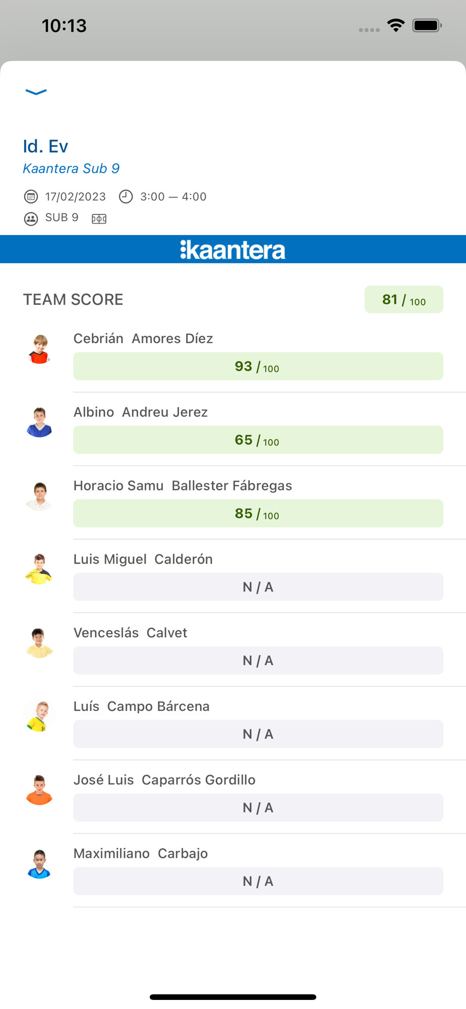 Aplicación de resultados y estadísticas de sesiones realizadas por clubs inscritos en Kaantera identificadas como sesiones de entrenamiento, de evaluación y de partido.