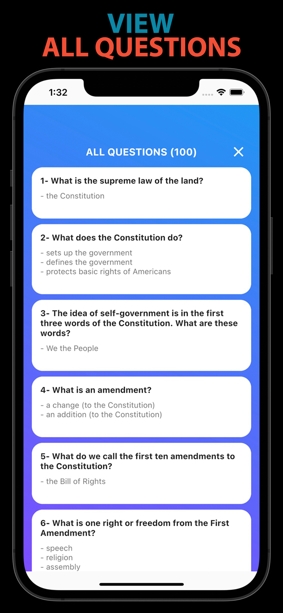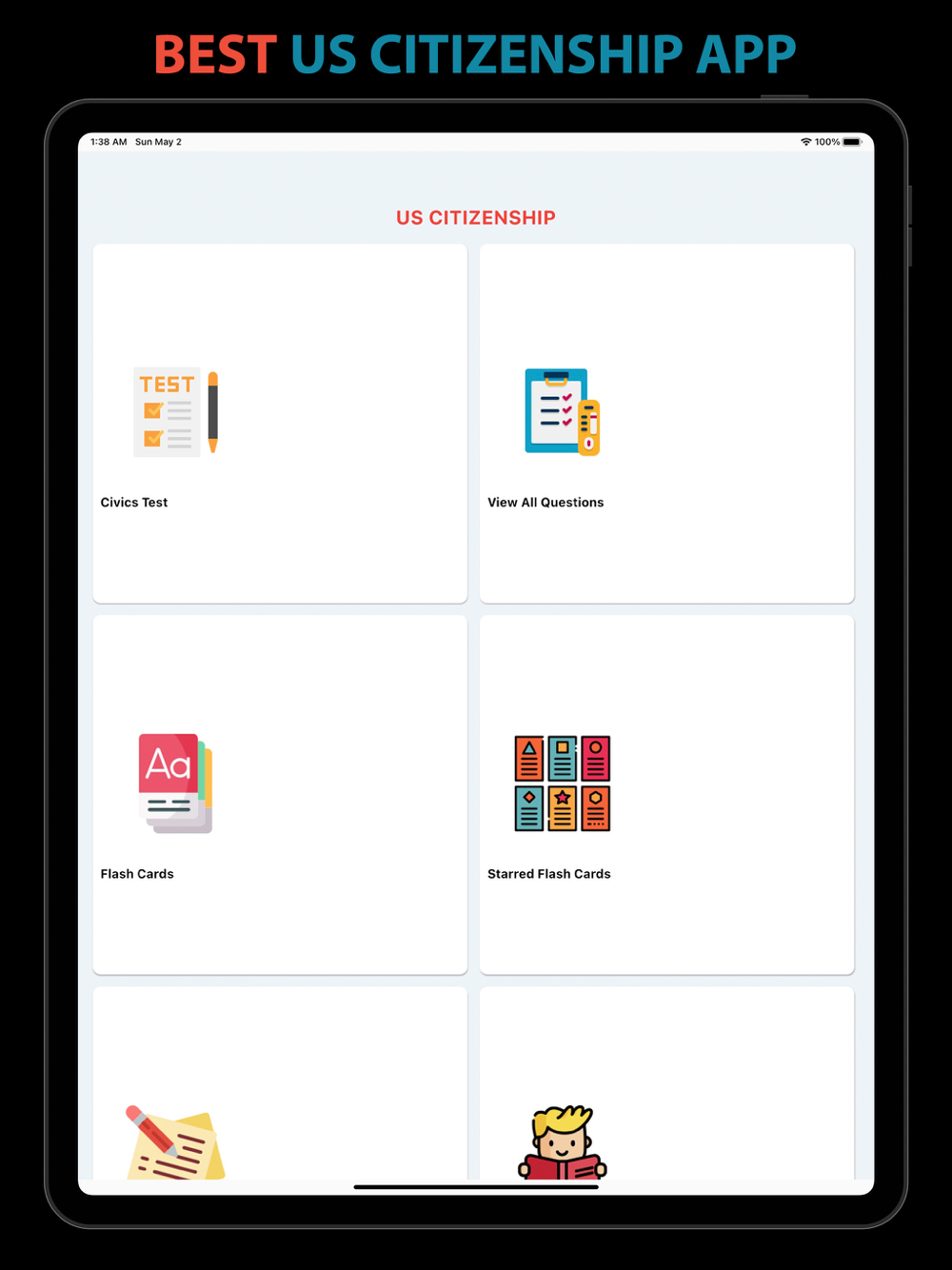 This app helps you study all 100 questions and evaluate your knowledge by taking a multiple-choice practice test (View questions in random orders), flash cards for all 100 questions and create your own flash card by selecting your favorites questions (Starred Flash Card). You can also enable audio for all Civics Test and flash card so that you can hear questions as you study.