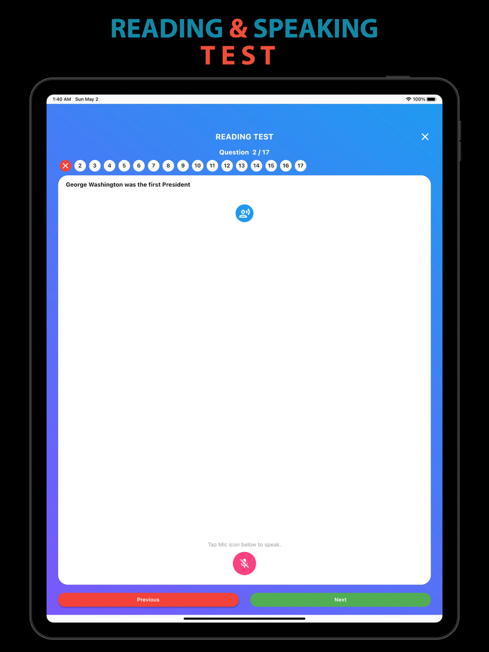 o Reading: You must read aloud one out of three sentences correctly to demonstrate an ability to read in English. This app helps you study for this reading portion of the test by asking you to read the given sentence and repeat it using your microphone. The content focuses on civics and history topics.