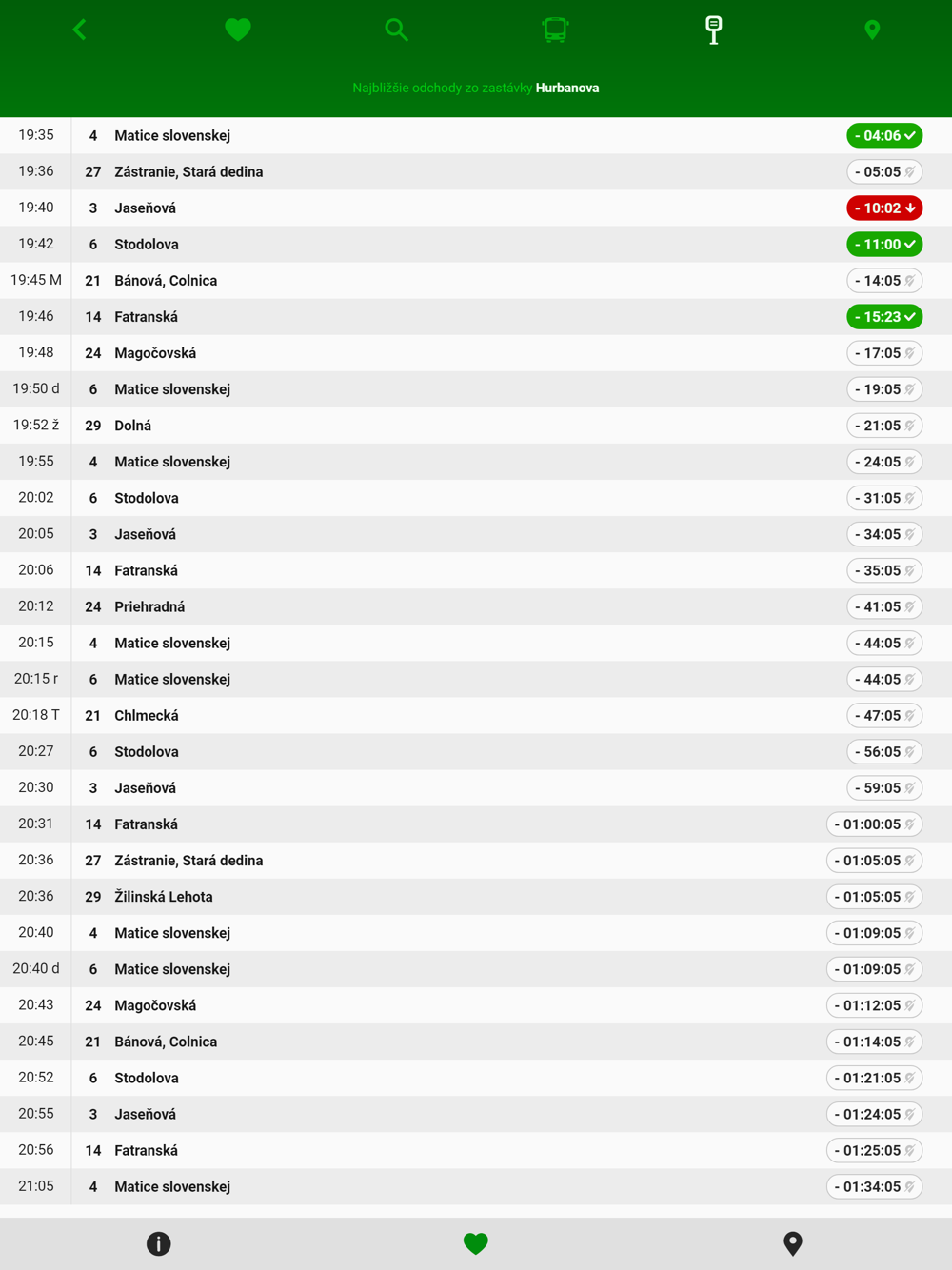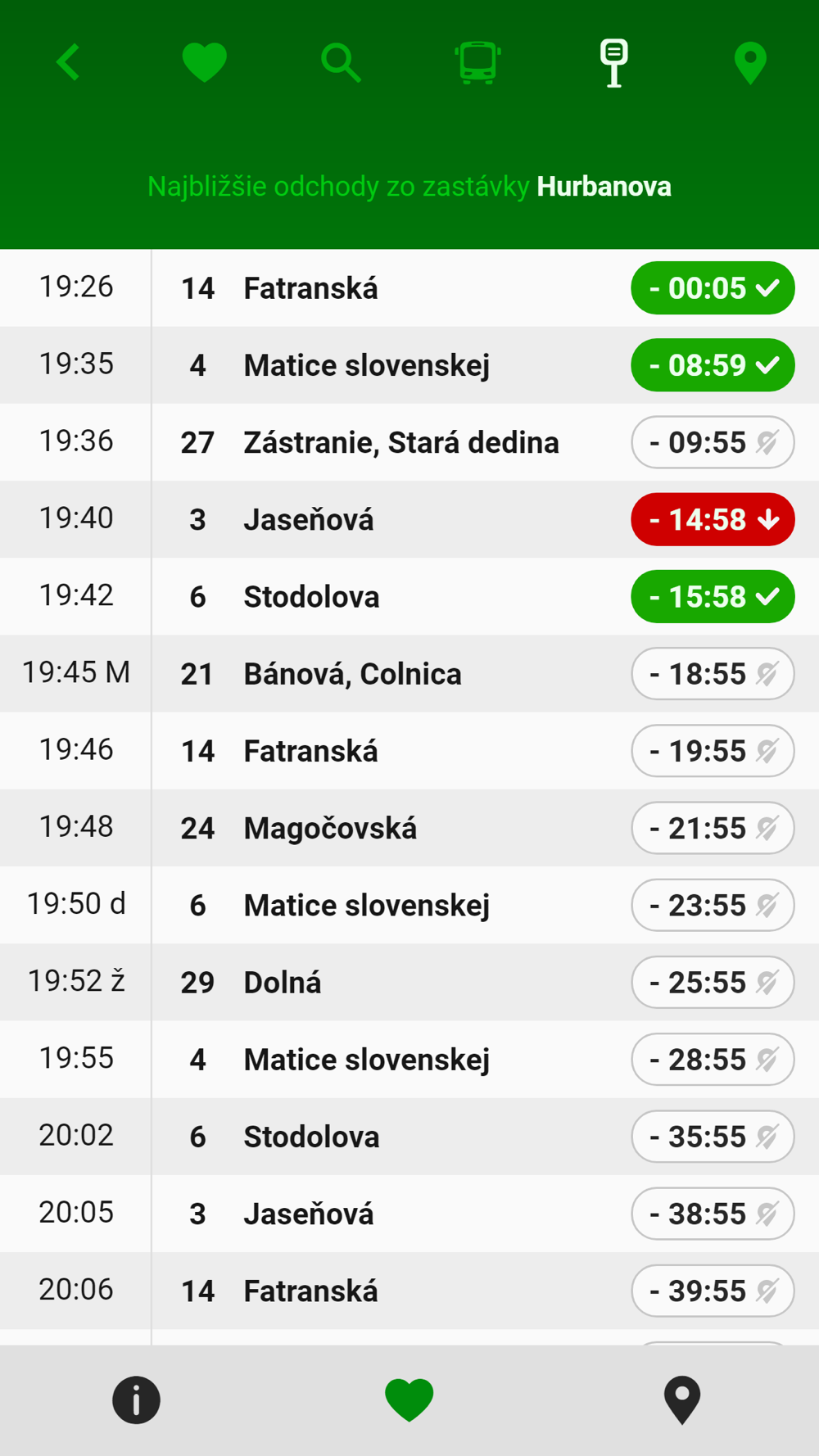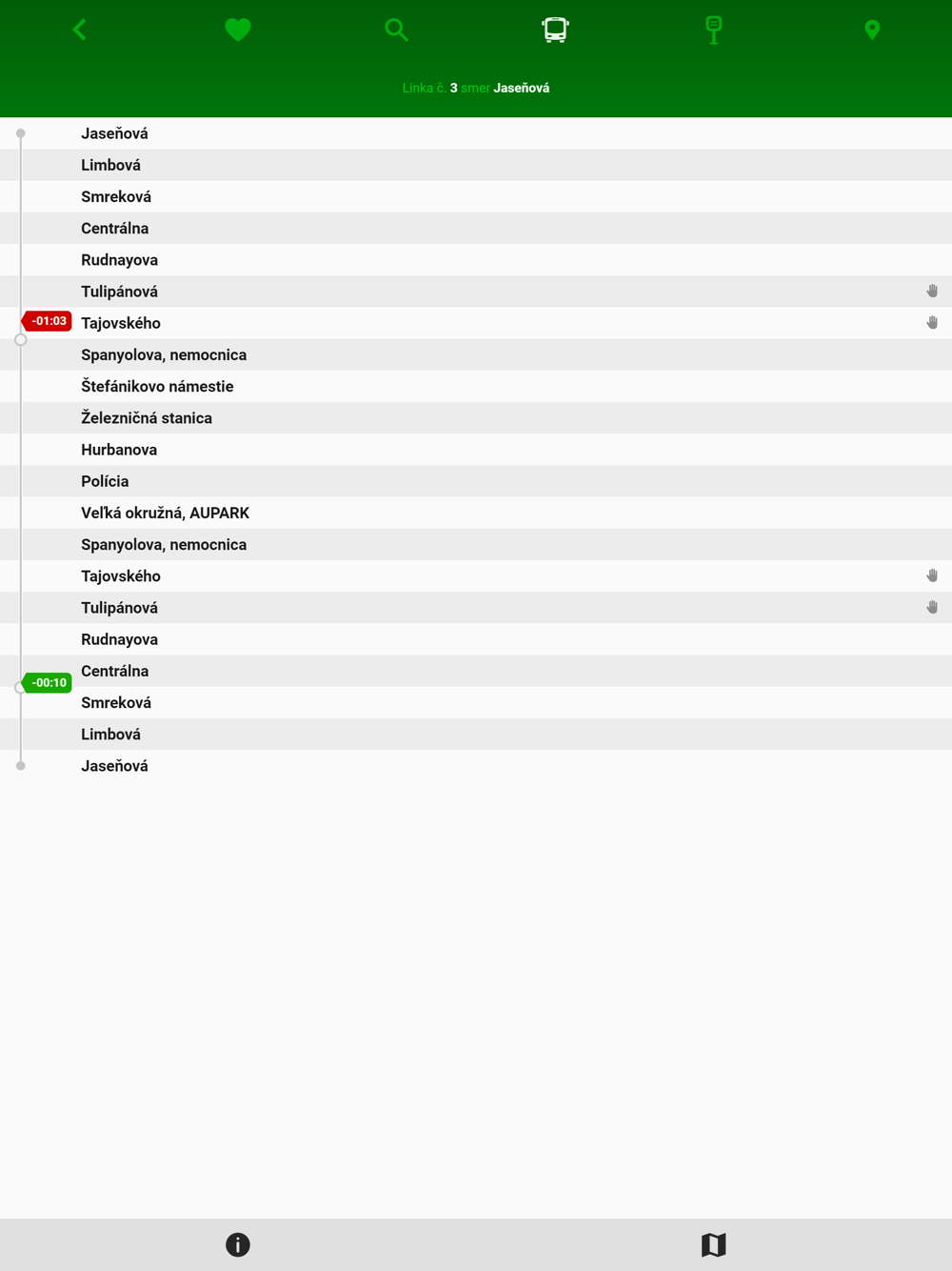 Ulož si obľúbený Bus alebo obľúbenú Zastávku, z ktorej často cestuješ. Odpočet ti ukáže koľko ti ostáva do odchodov obľúbených busov. Ak zmeškáš, nevadí, odpočet začína znova pre nasledujúci spoj. Navyše ak nestíhaš, môžeš si kúpiť aj SMS lístok. O aktuálne cestovné poriadky sa aplikácia postará sama, preto ťa už nezaskočí žiadna zastávka s prelepeným oznamom ;) K dispozícii je aj zobrazenie polohy autobusov/trolejbusov, zastávok a trás liniek na mape. Aplikácia upozorní aj na prípadne výluky a oznamy dopravného podniku.