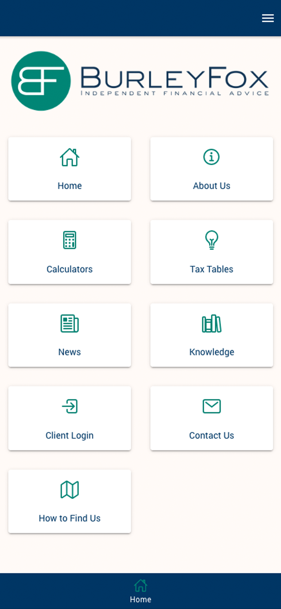 The Burley Fox app is a financial adviser application built for Burley Fox Independent Financial Advice. The app features financial calculators, magazines, tax tables and also client login function. The Burley Fox Independent Financial Advice app comes with push-notifications enabled to keep users updated with all the latest financial updates.