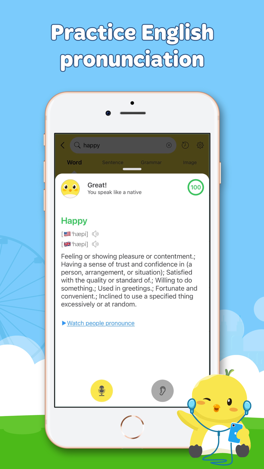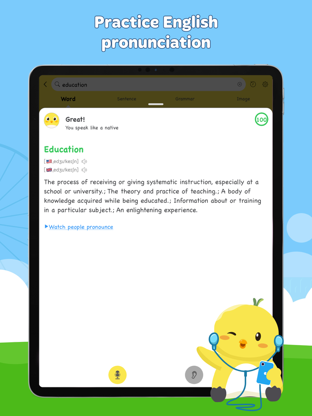 Improve English pronunciation: Dunno English Dictionary – English Translation helps you practice speaking skills and get clearly feedback.