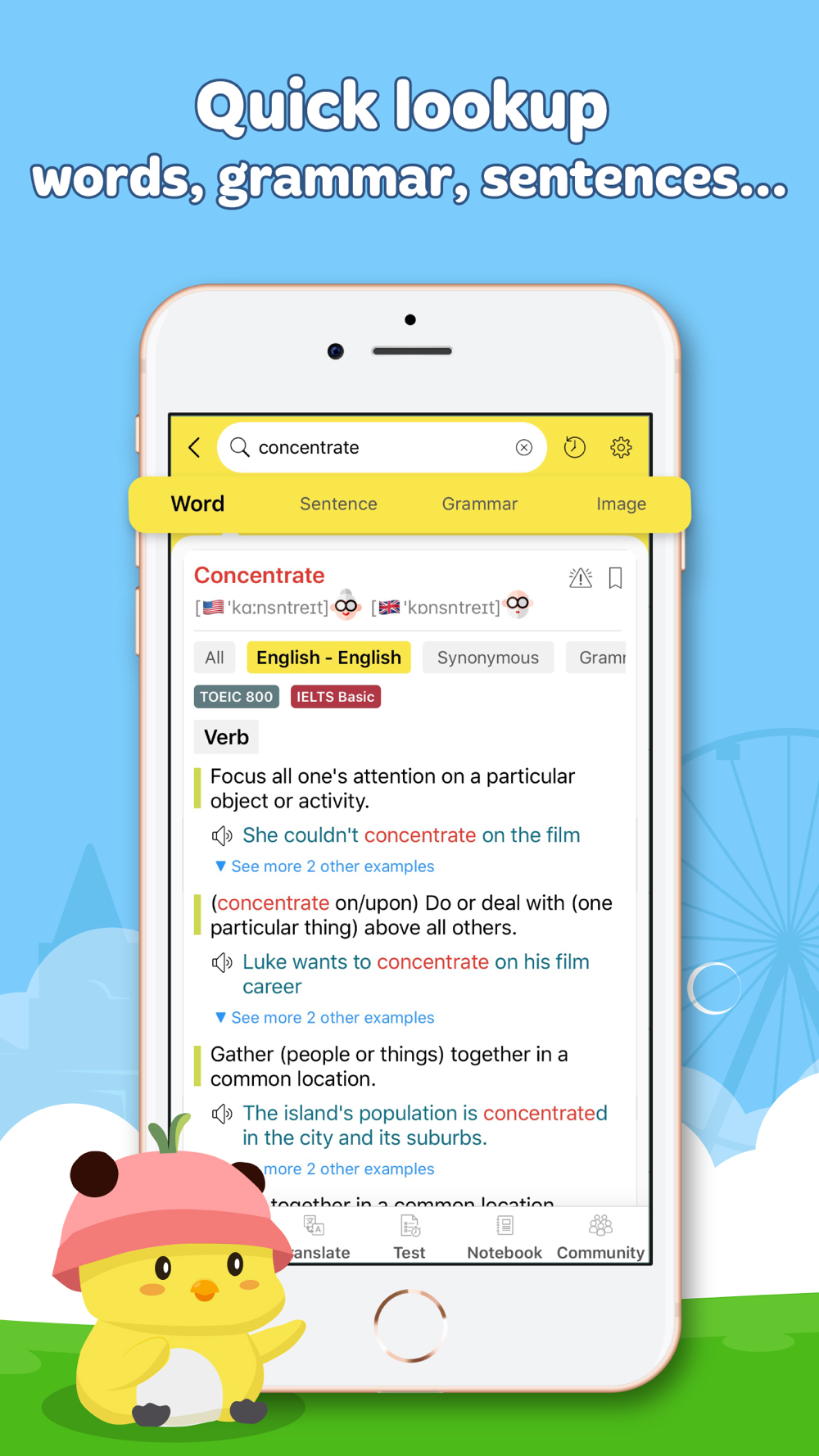 - Offline English dictionary: look up words, grammar, prepositions, sentence patterns, images.....
