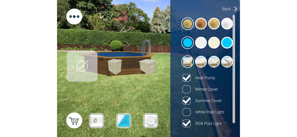 Place a virtual swimming pool of its natural size in your garden or patio. With this application, you can easily and quickly choose your pool, colour or additional accessories.