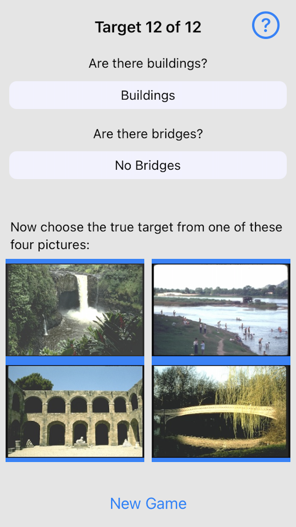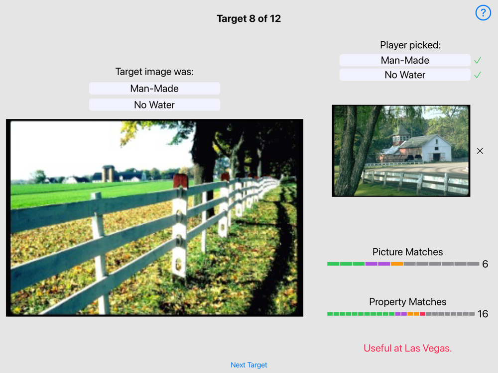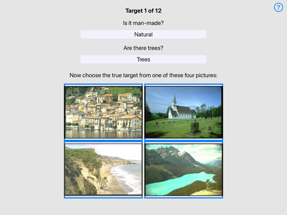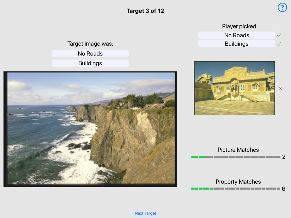 Four pictures will then appear. Tap the picture that best matches your mental image. The correct picture will fill the screen. After 12 pictures you may begin a new game.