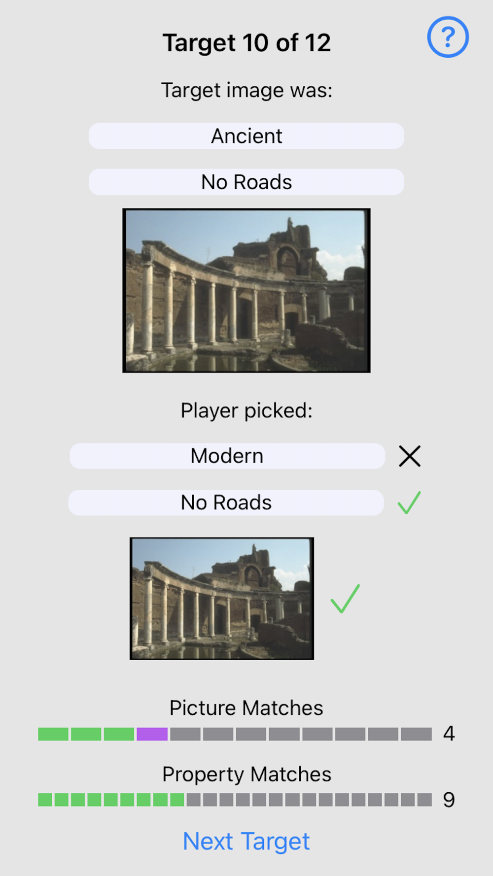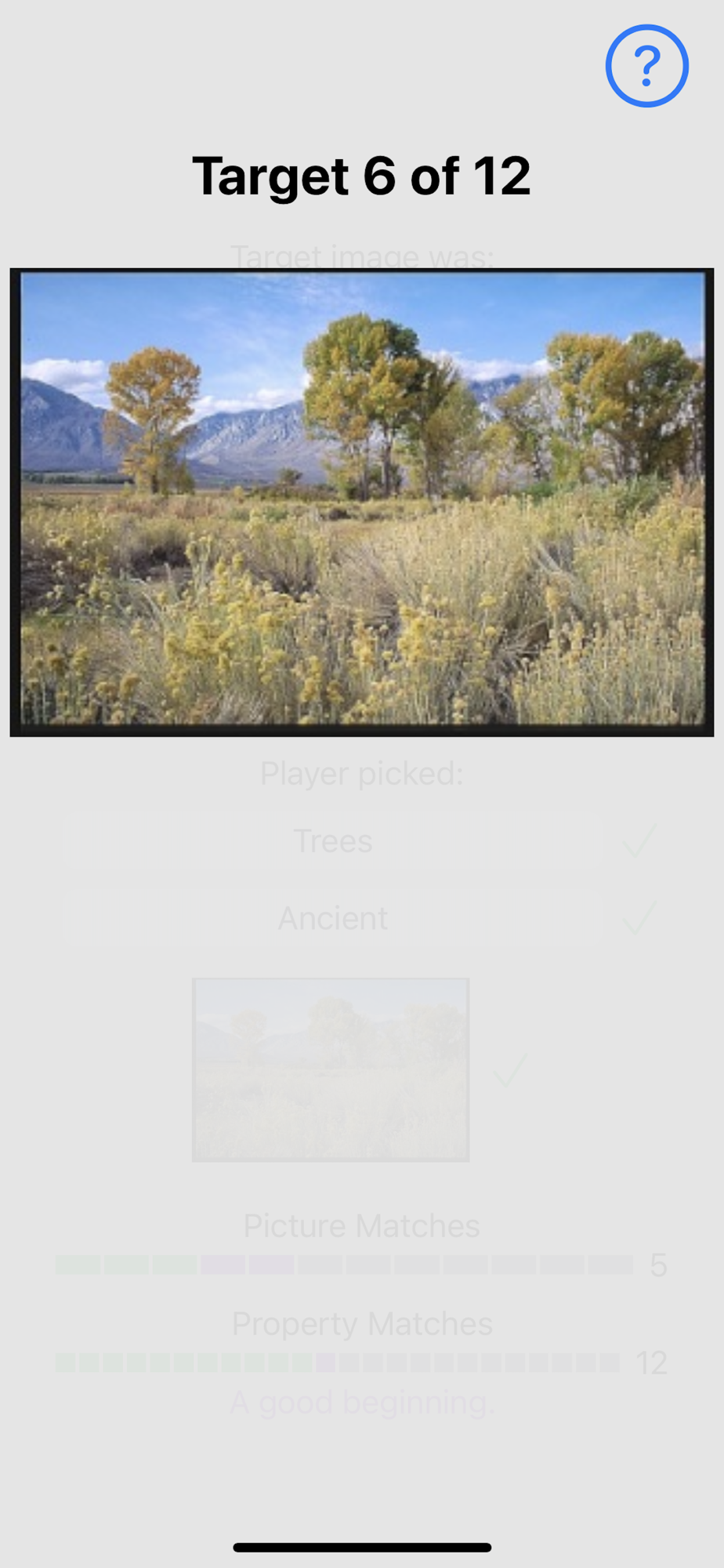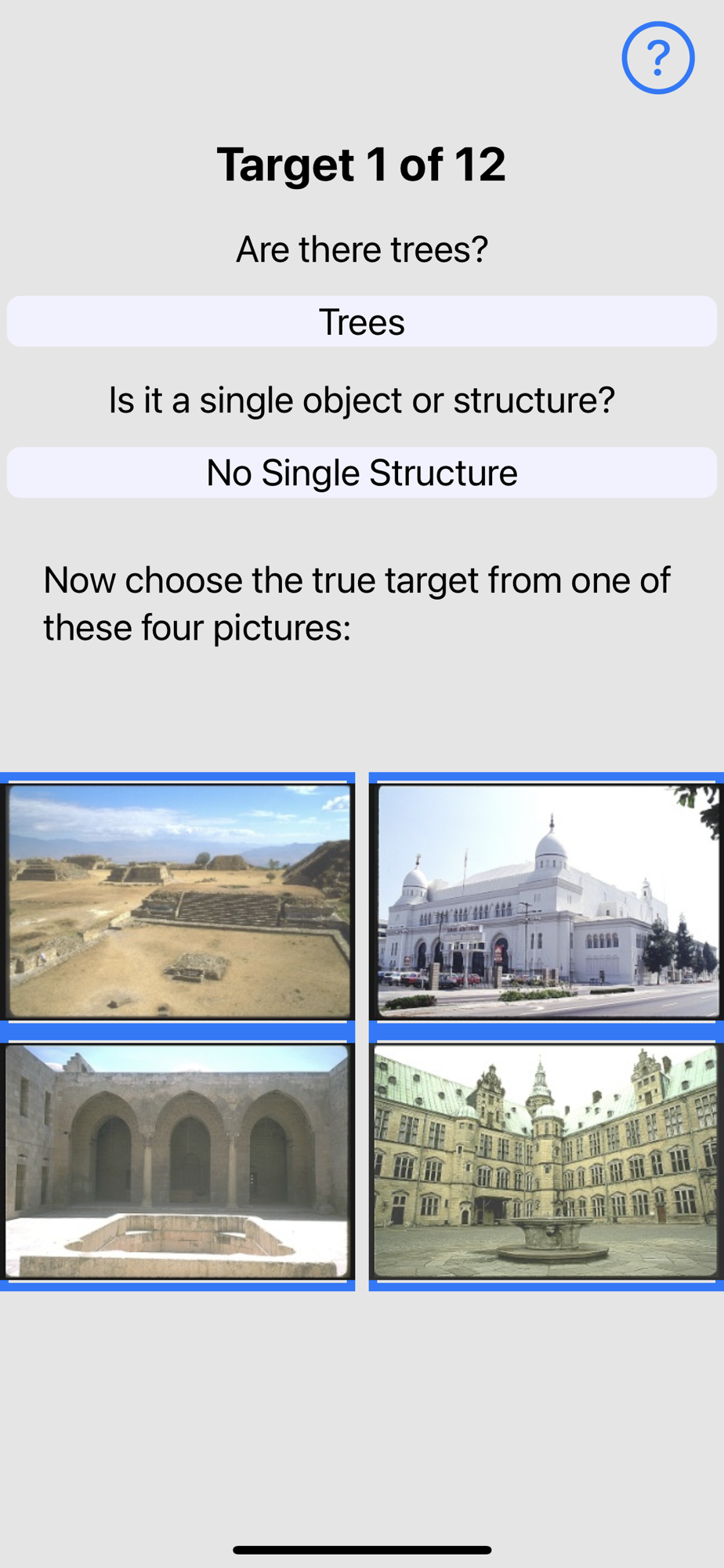 Four pictures will then appear. Tap the picture that best matches your mental image. The correct picture will fill the screen. After 12 pictures you may begin a new game.
