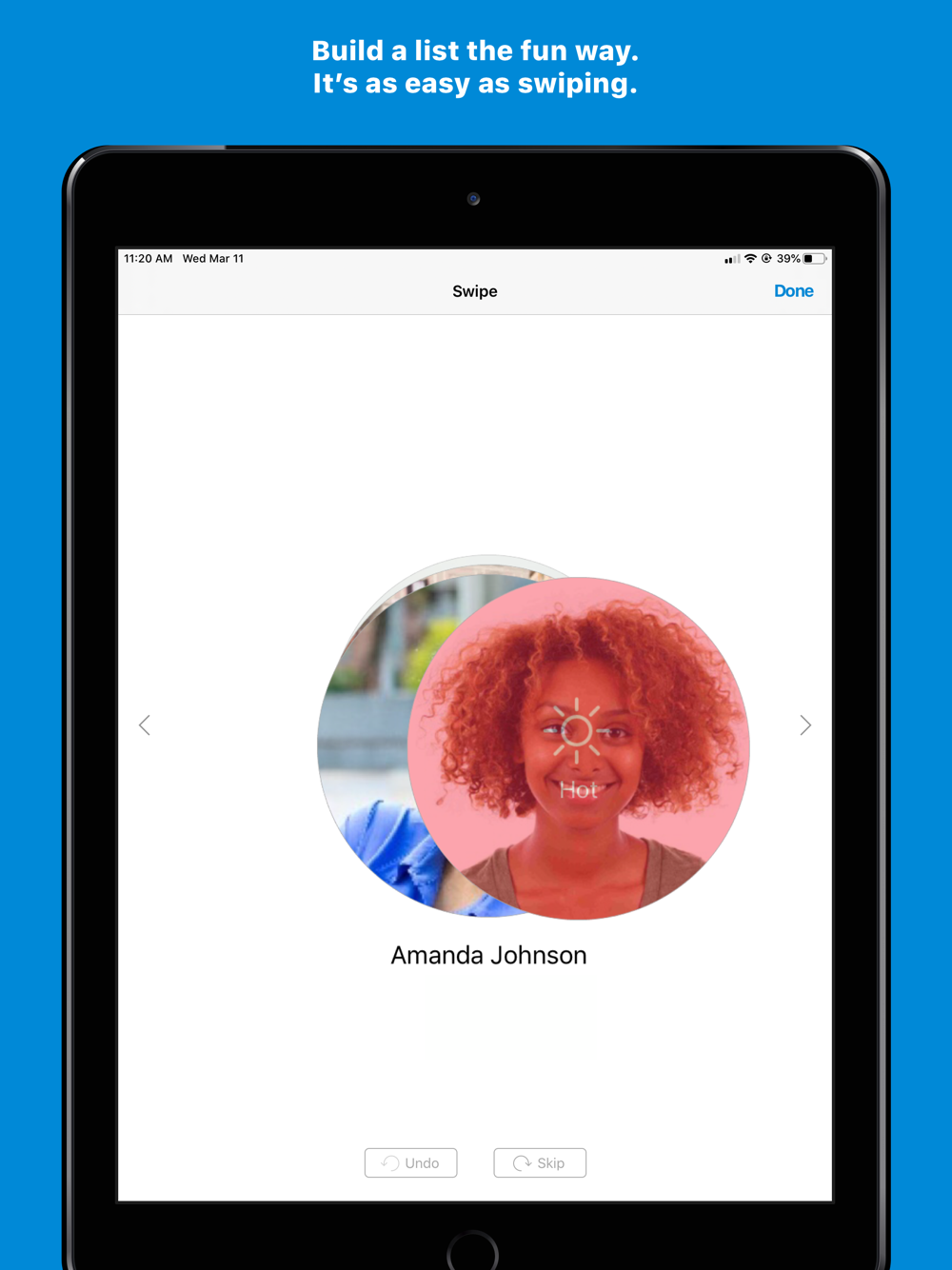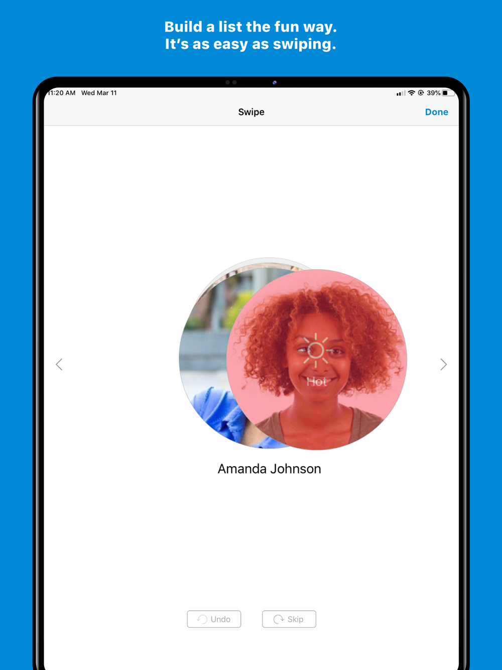 Contacts: Choose how to sync and manage your contacts. Swipe to sort them by interest level. You can make connections, add notes, or check out the Contact Feed to see the tools you've shared and contact actions.