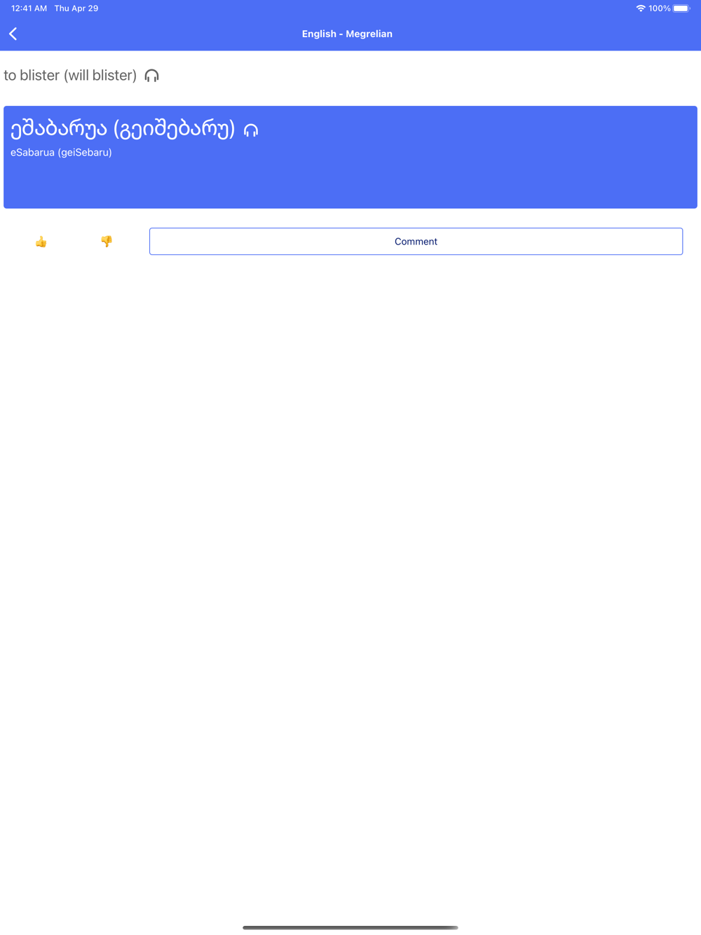 Through the application you will be able to translate Georgian, Megrelian and English words.