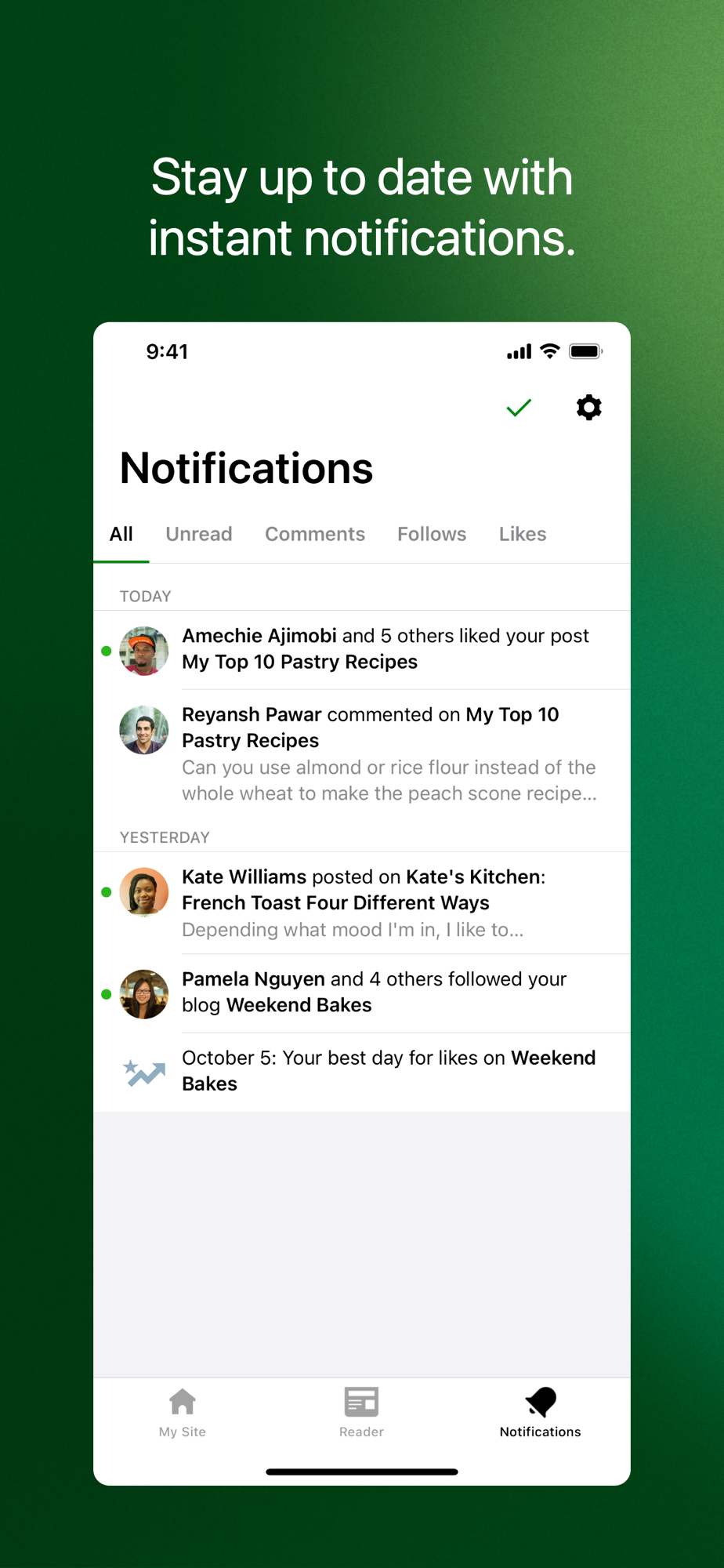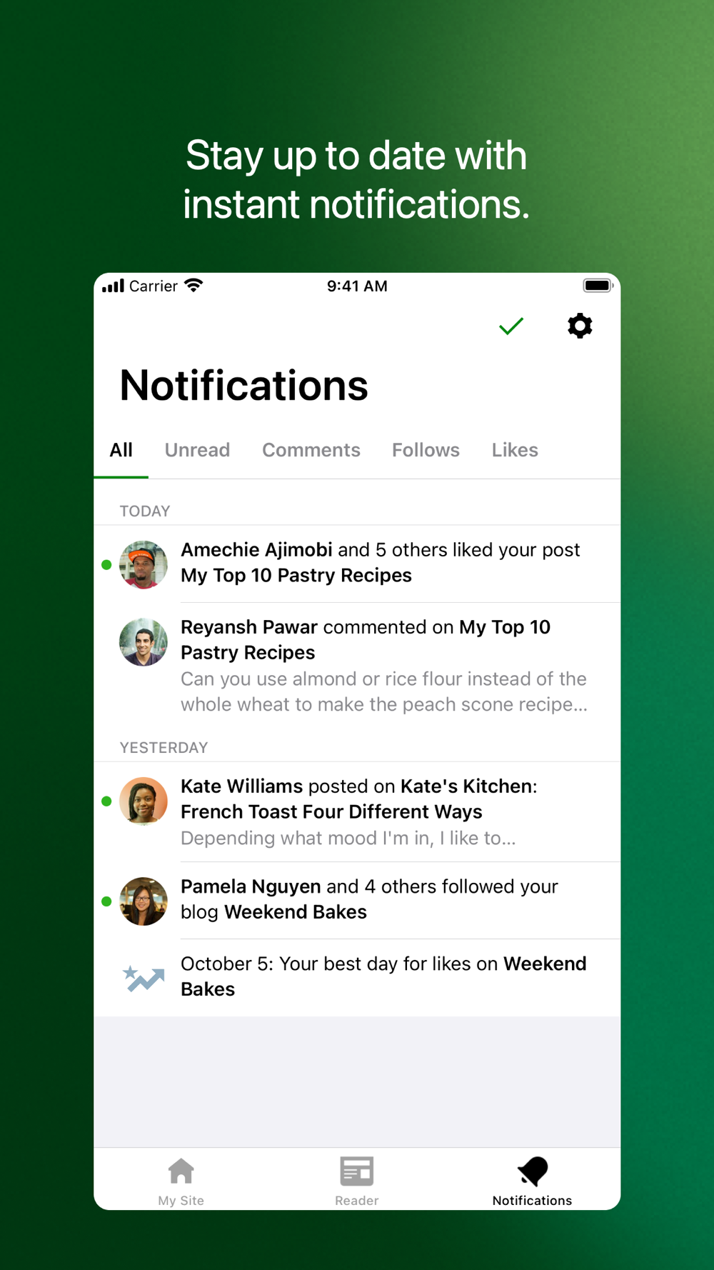 Get notifications about comments, likes, and new followers so you can see people reacting to your website as it happens.