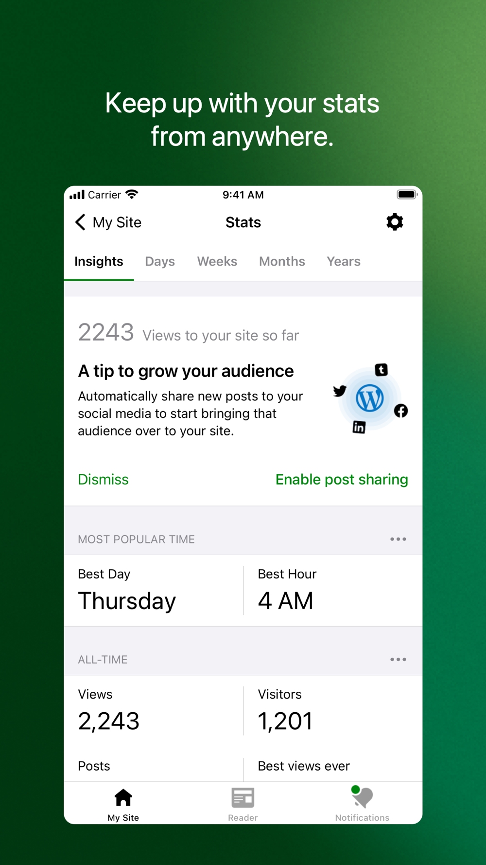 Track which posts and pages get the most traffic over time by exploring daily, weekly, monthly, and yearly insights.