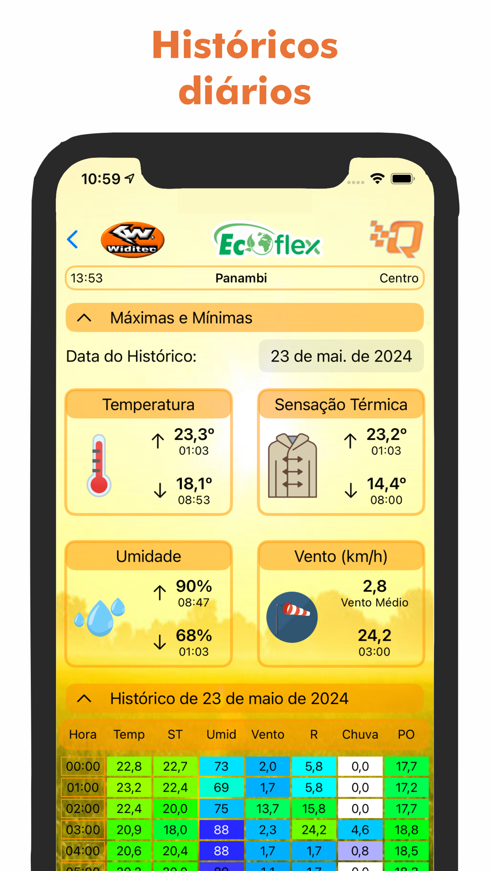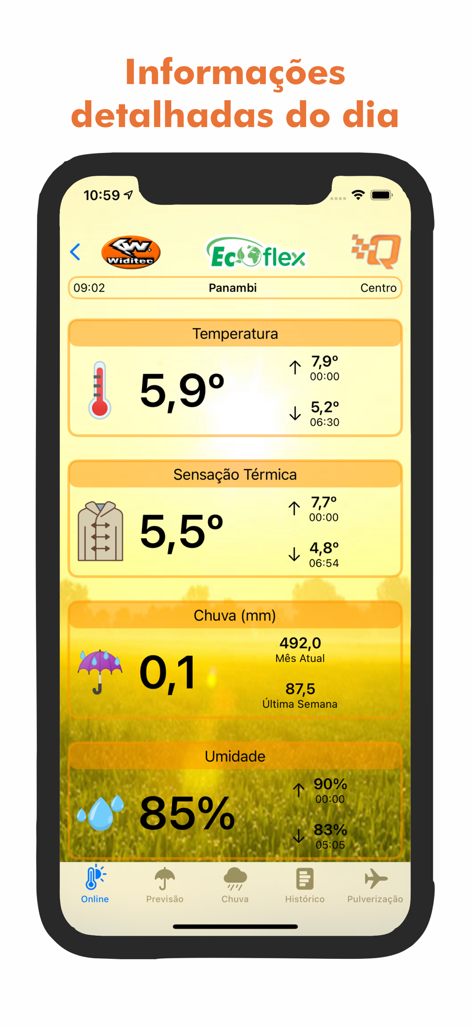 Reunidos em um único aplicativo: Temperatura, Sensação Térmica, Umidade, Ponto de Orvalho, Vento e dados Pluviométricos podem ser acessados a qualquer momento e de qualquer lugar.