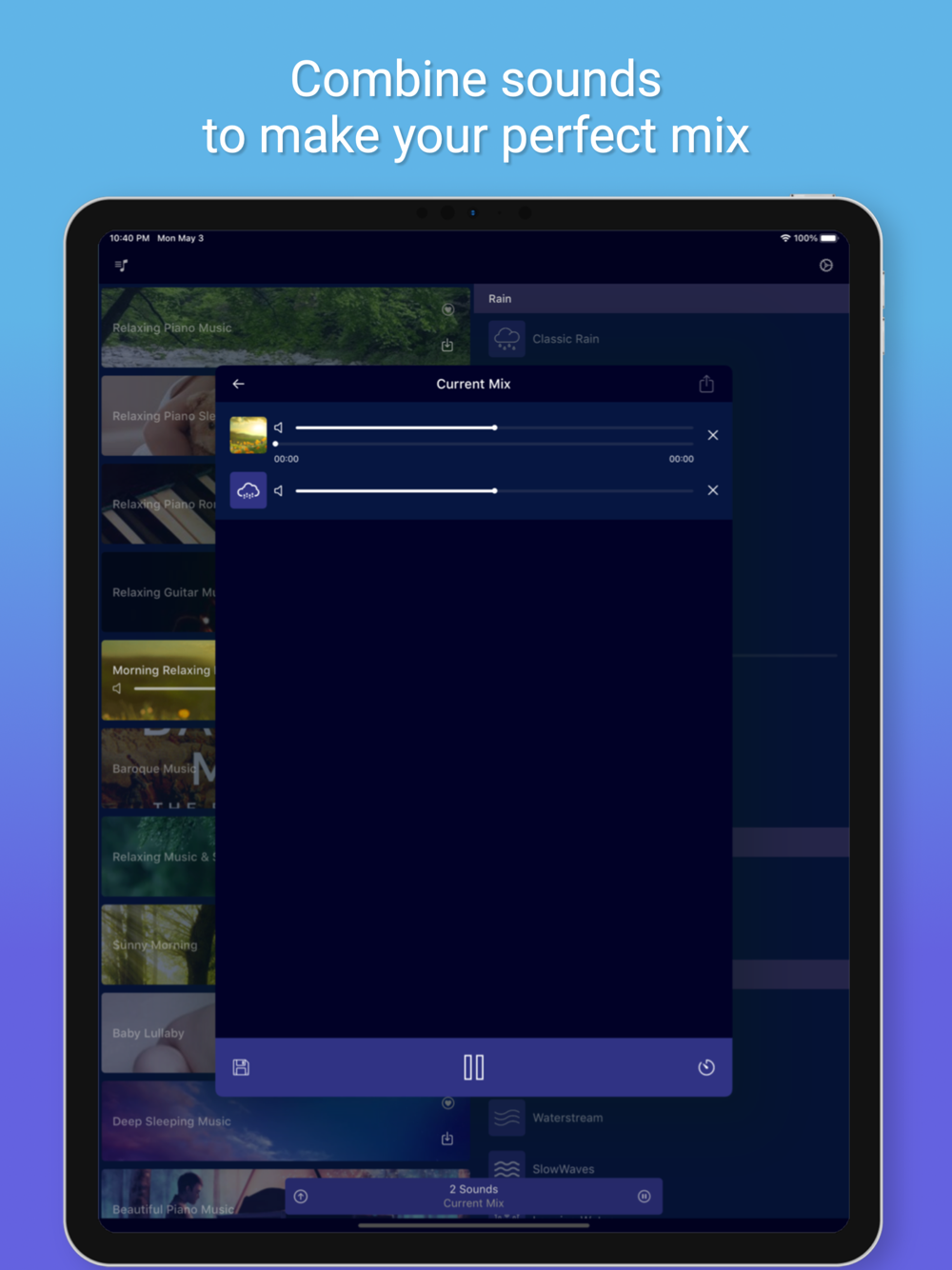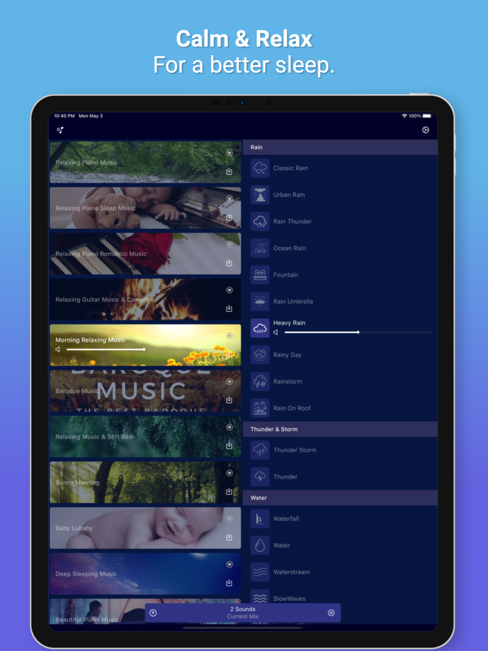 Sleep Sounds brings great collection of HD sounds that can be mixed into the perfect relaxing ambiences. You can choose from different types of rain, nature sounds, city sounds, white noise or instruments. Save your favorite sound mixes so they are always by hand with you.