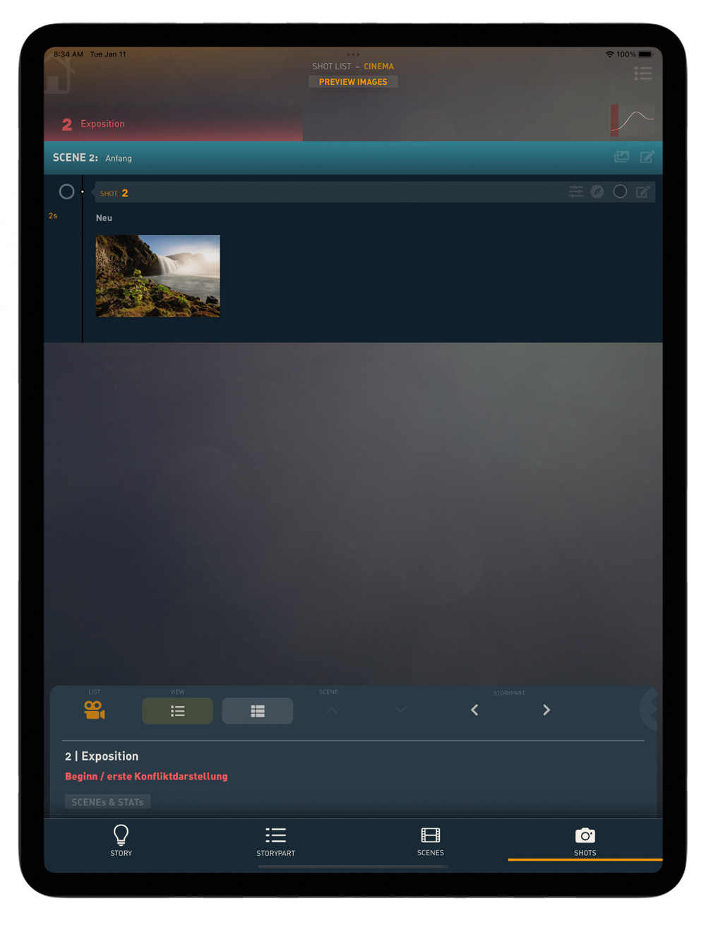 With STORY & FILM you divide your story into STORYPARTS, SCENES and SHOTS. This is a common subdivision to keep track of the narrative structure and connections.