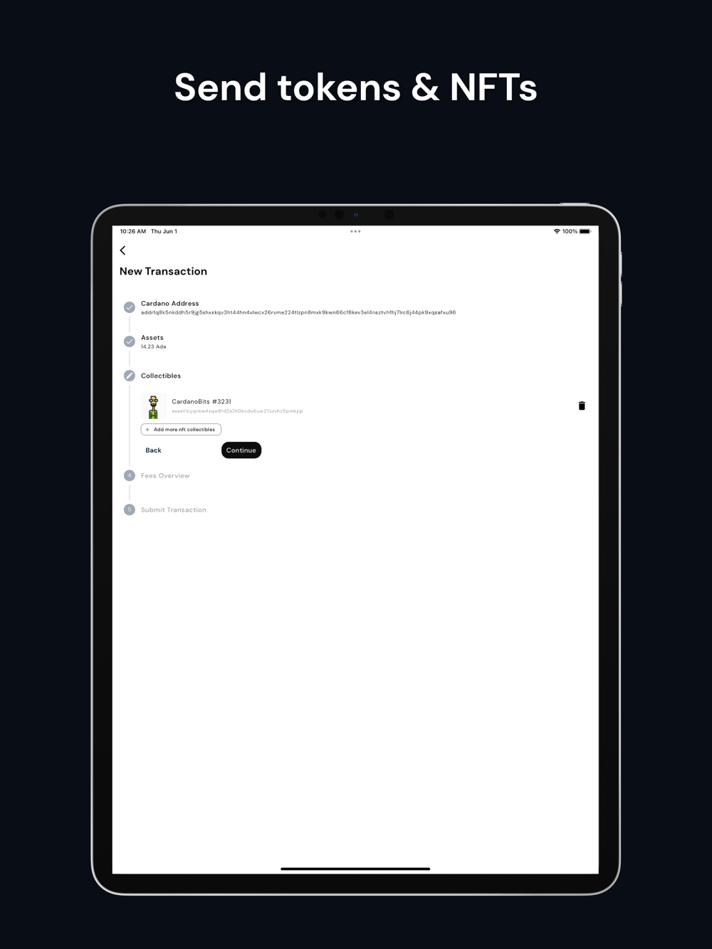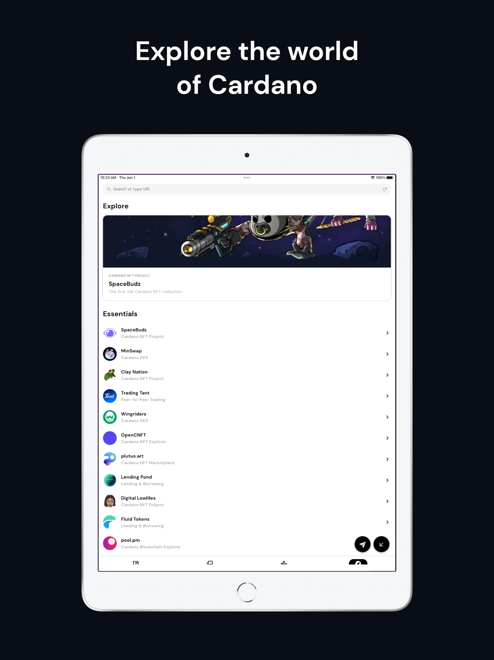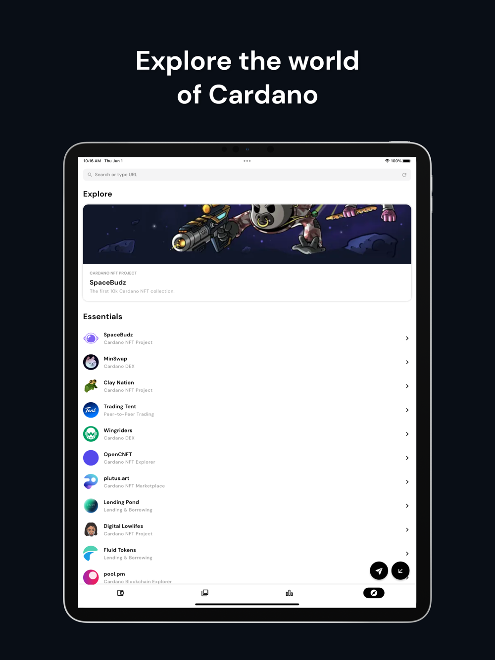 VESPR focuses on providing lightning-fast speed and unmatched reliability, allowing you to make transactions anytime, anywhere. Send, store, and receive Cardano native tokens, showcase your NFT collection, connect to dApps, and carry the world of Cardano with you wherever you go.