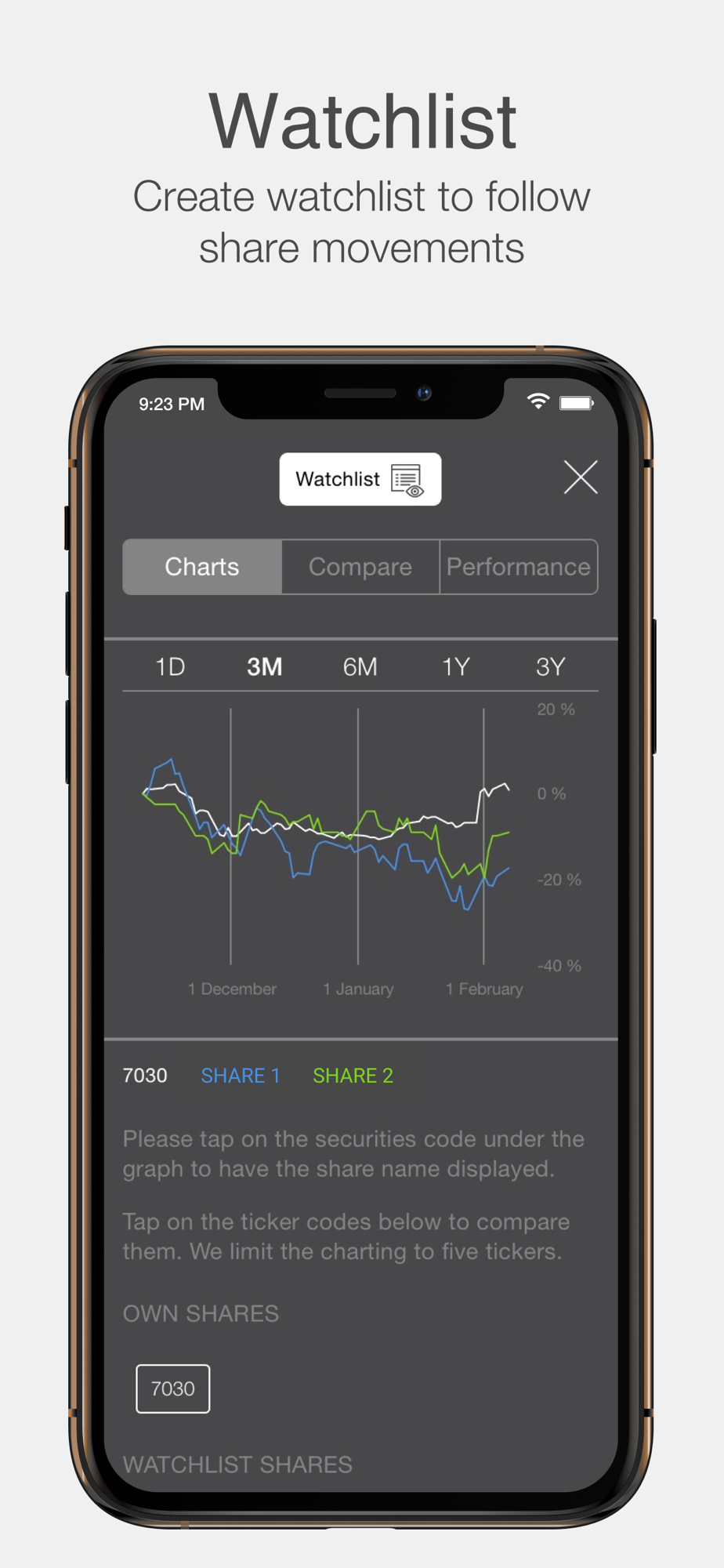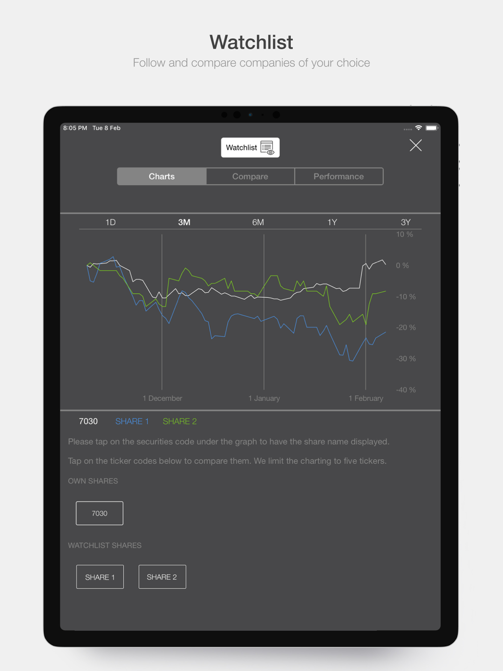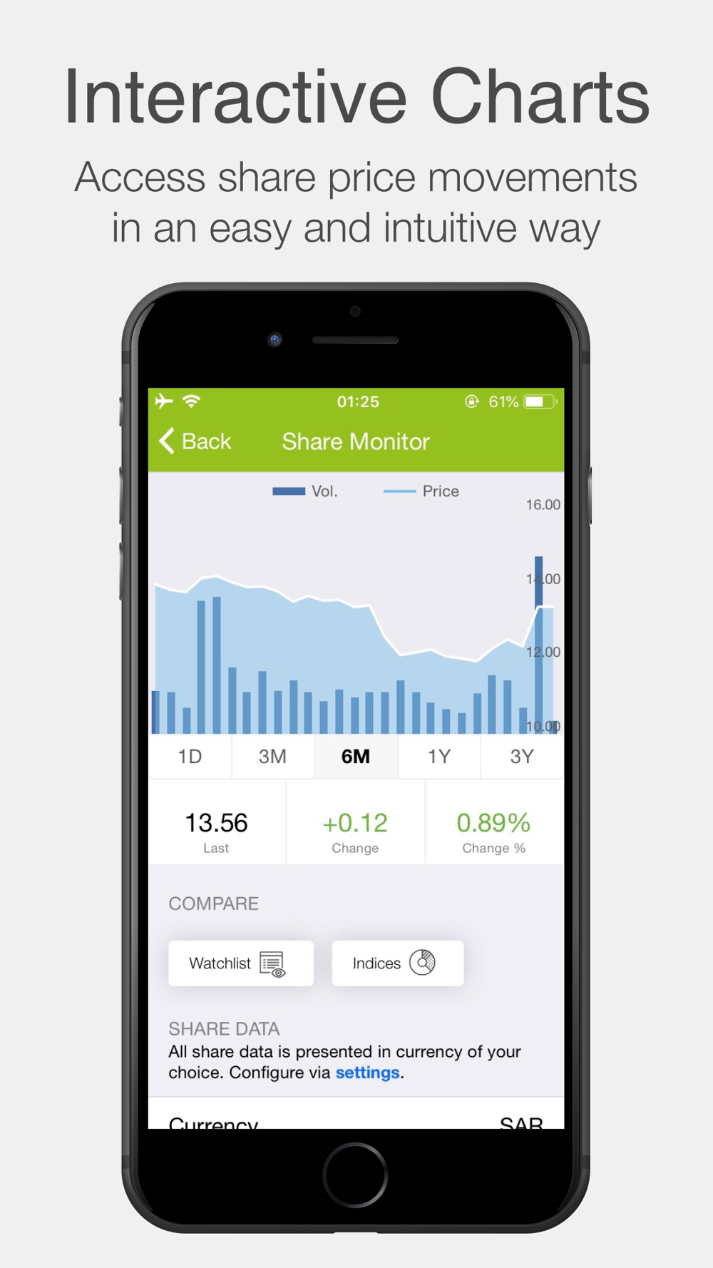 - Detailed Interactive charts on stock performance, news, and events push notifications