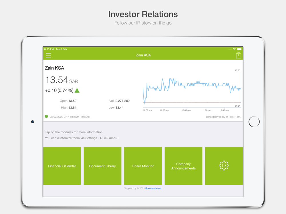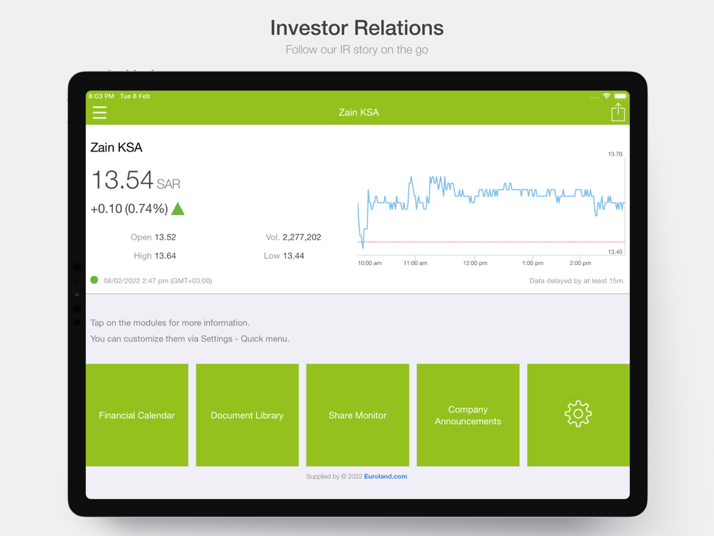 With the Zain KSA Investor Relations app, you can stay on top of the latest share price data, stock exchange developments and company announcements for Mobile Telecommunication Company Saudi Arabia (7030) You can also view a detailed calendar of IR related events and much more.