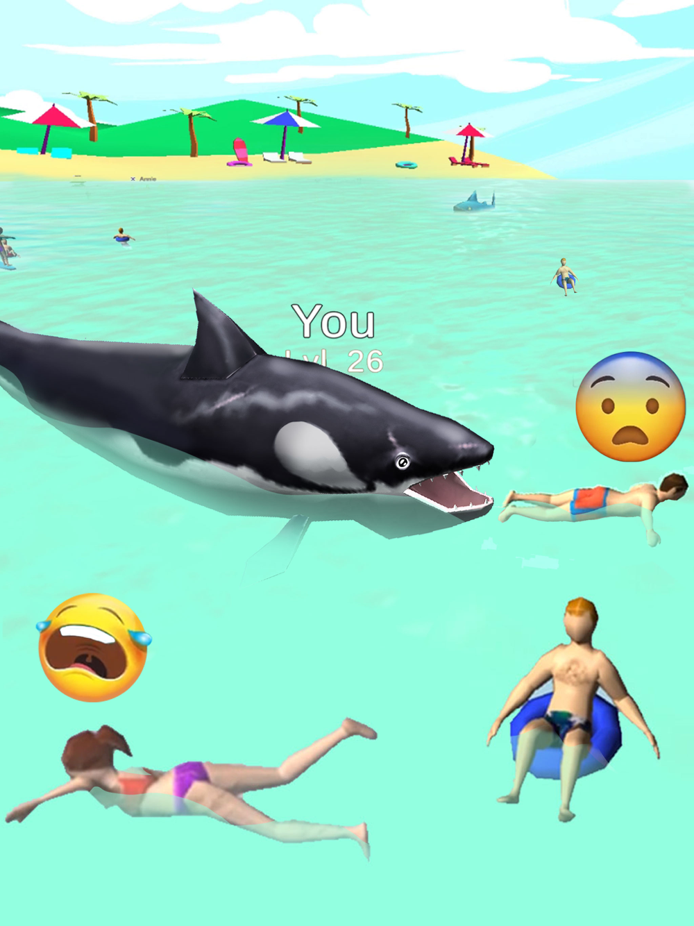 Play as a hungry killer shark and feast on unsuspecting beach-goers! Feast on them or scare them for fun!