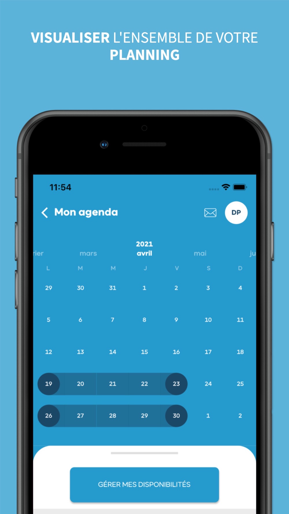 Retrouver l'ensemble des missions qui vous sont confiées dans votre planning, indiquer vos disponibilités ou indisponibilités,