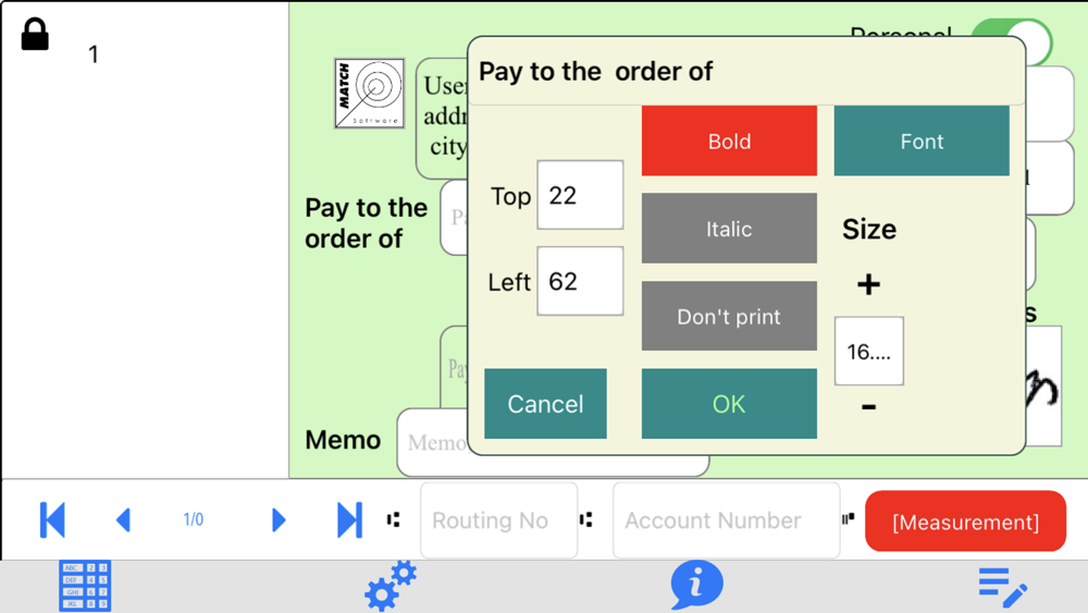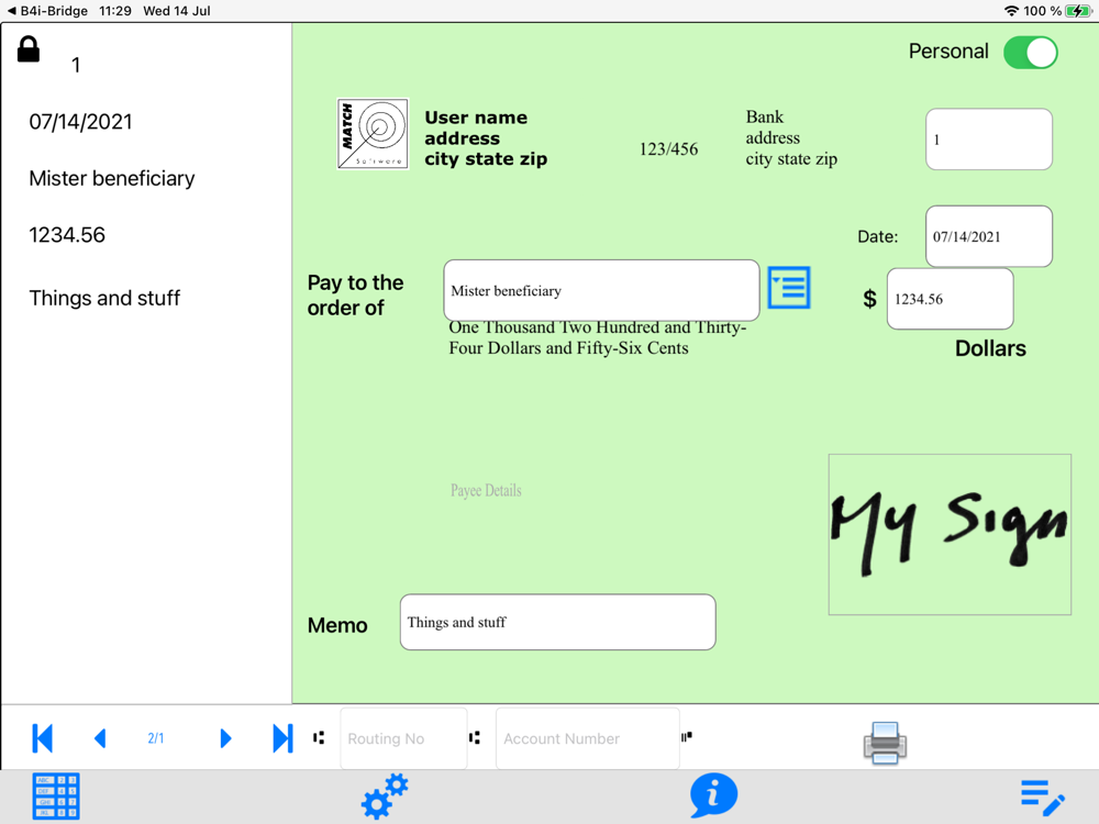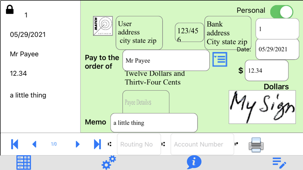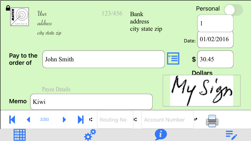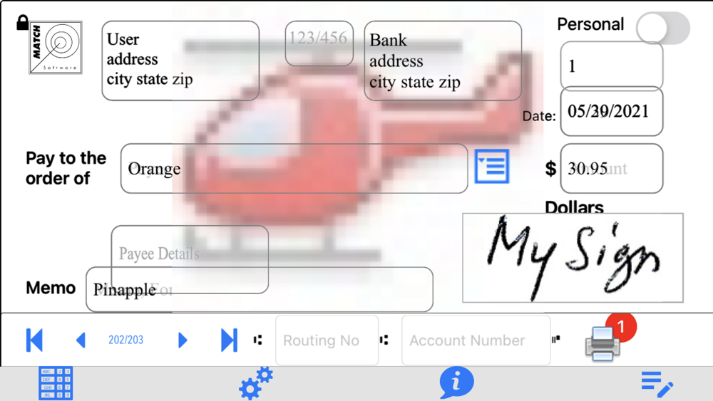 Print checks directly from your iOS device with this easy to use check printing application : enter the order (payee), the Dollar amount, and voila ! Check Printer+ will automatically generate the word amount so you do not have to worry about spelling it out. You can also print blank checks to take with you.