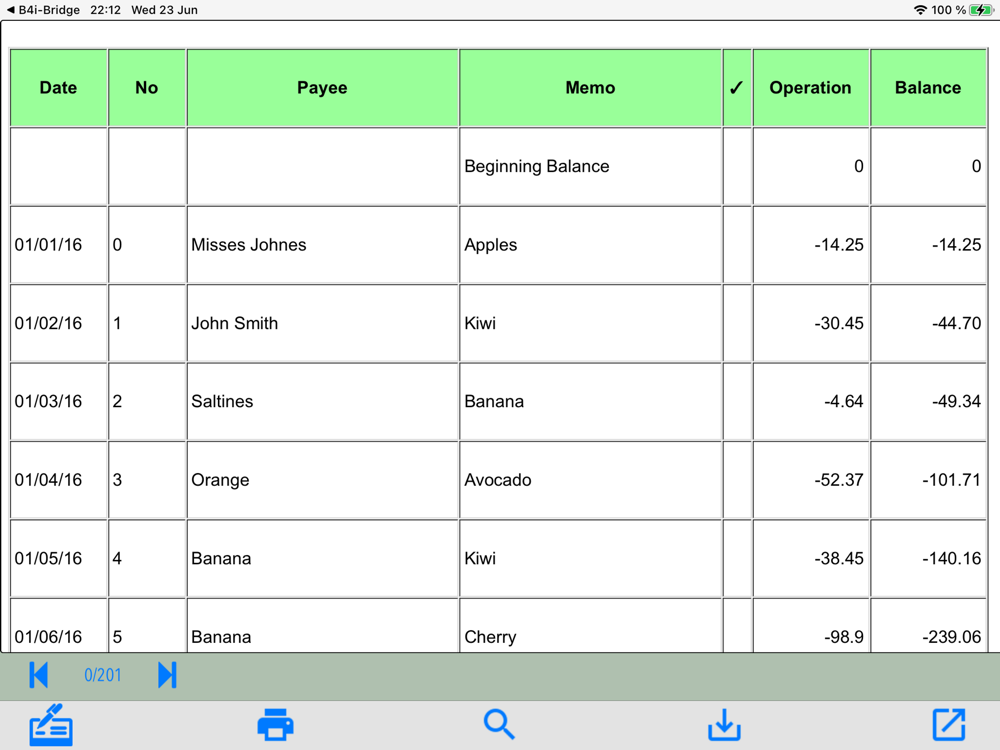 The Register can be printed in spreadsheet format. Search easily throughout the register content: date, number, memo, amount.