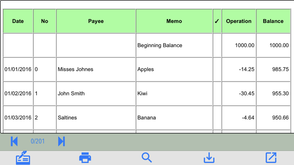 Keep track of all your expenses and deposits with the built-in electronic record book (Register). Balance is calculated automatically. Reconcile with your bank statement just as easily as you would with a paper record book. Save, load data and settings to use different accounts.